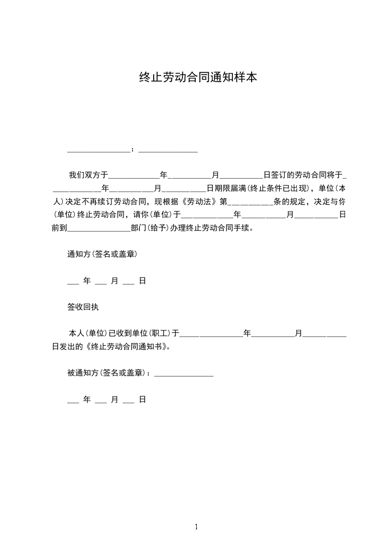 我们双方于_____________年___________月___________日签订的劳动合同将于_____________年___________月___________日期限届满(终止条件已出现),单位(本人)决定不再续订劳动合同,现根据《劳动法》第___________条的规定,决定与你(单位)终止劳动合同,请你(单位)于_____________年___________月___________日前到________________部门(给予)办理终止劳动合同手续。