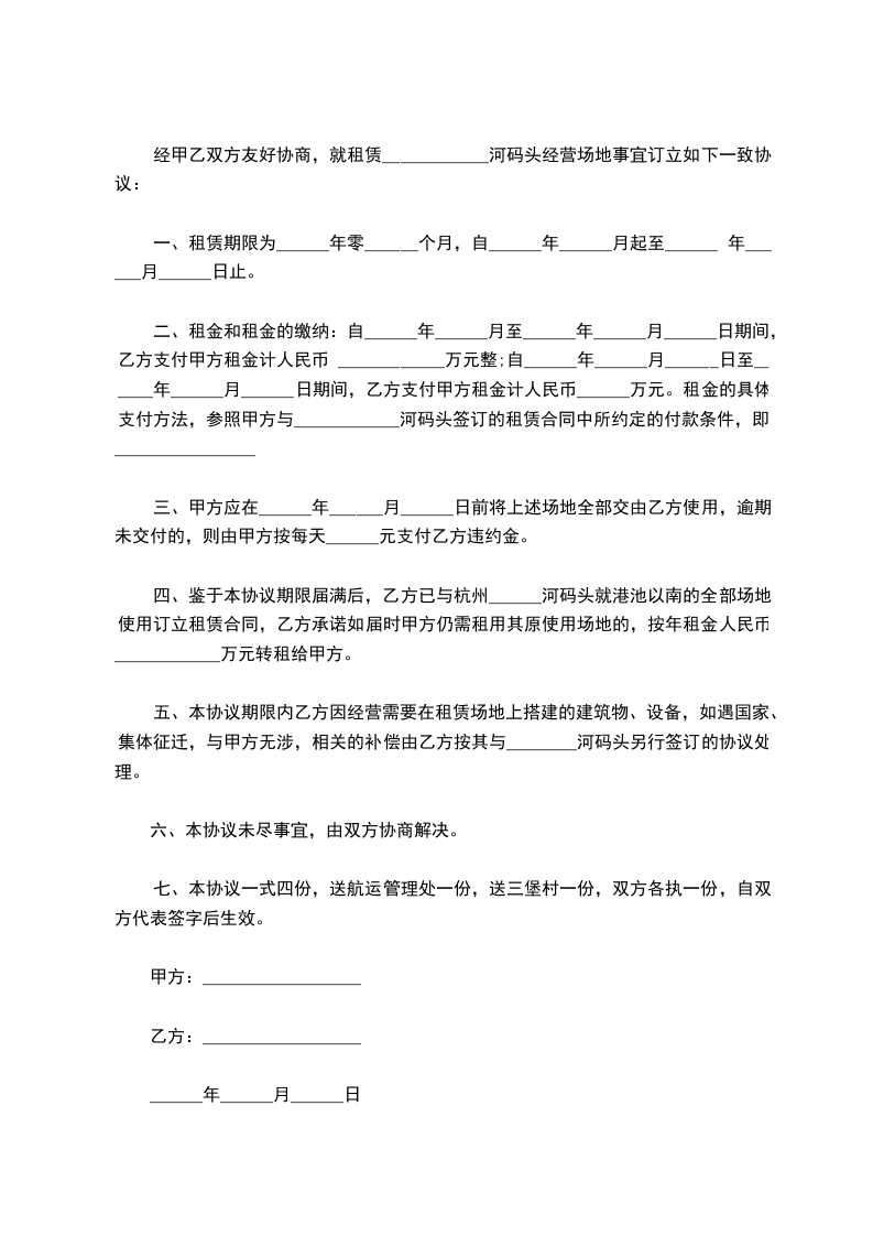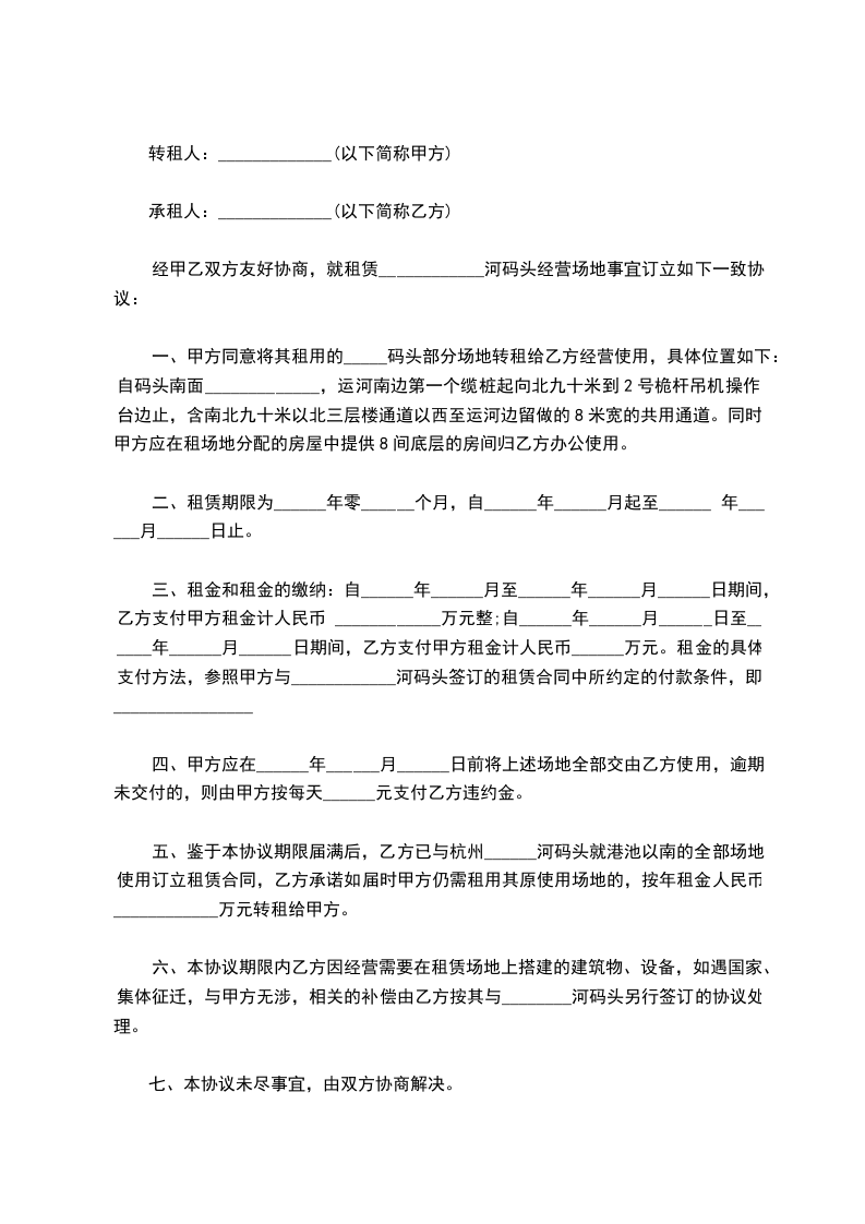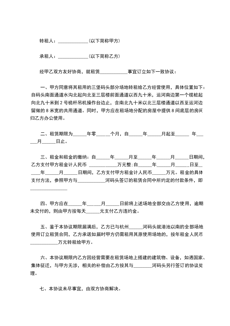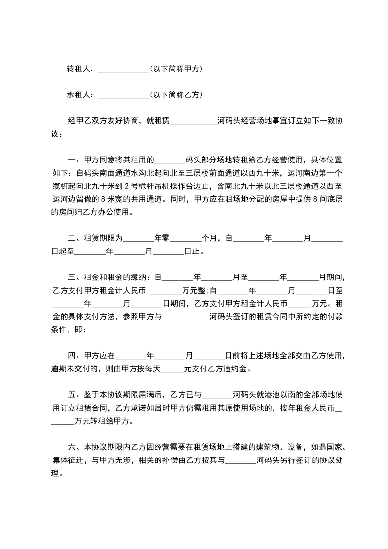 五、鉴于本协议期限届满后,乙方已与杭州______河码头就港池以南的全部场地使用订立租赁合同,乙方承诺如届时甲方仍需租用其原使用场地的,按年租金人民币____________万元转租给甲方。