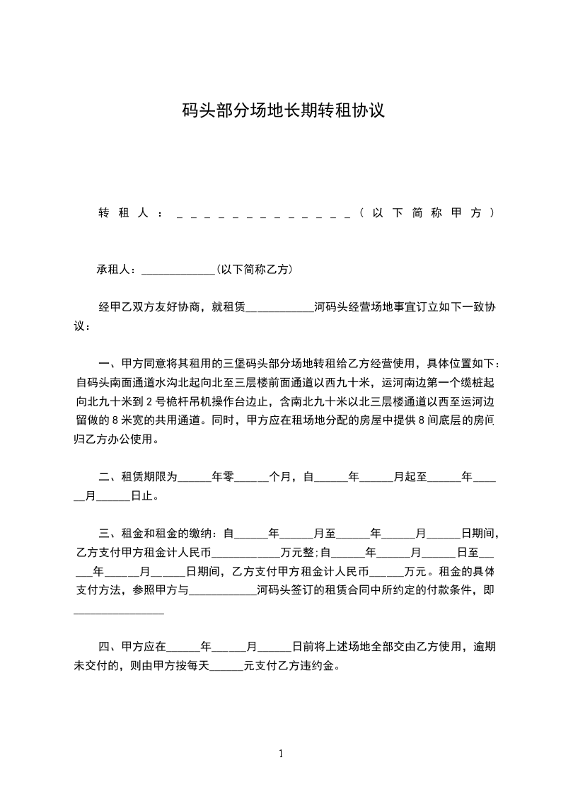 一、甲方同意将其租用的三堡码头部分场地转租给乙方经营使用,具体位置如下:自码头南面通道水沟北起向北至三层楼前面通道以西九十米,运河南边第一个缆桩起向北九十米到2号桅杆吊机操作台边止,含南北九十米以北三层楼通道以西至运河边留做的8米宽的共用通道。同时,甲方应在租场地分配的房屋中提供8间底层的房间归乙方办公使用。