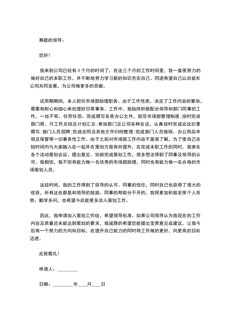 因此,我申请加入策划工作组,希望领导批准。如果公司领导认为我现在的工作内容及质量还未能达到策划的要求,我诚恳的希望您能提出宝贵意见或建议,让我今后有一个努力的方向和目标,在提升自己能力的同时将工作做的更好,向更高的目标迈进。