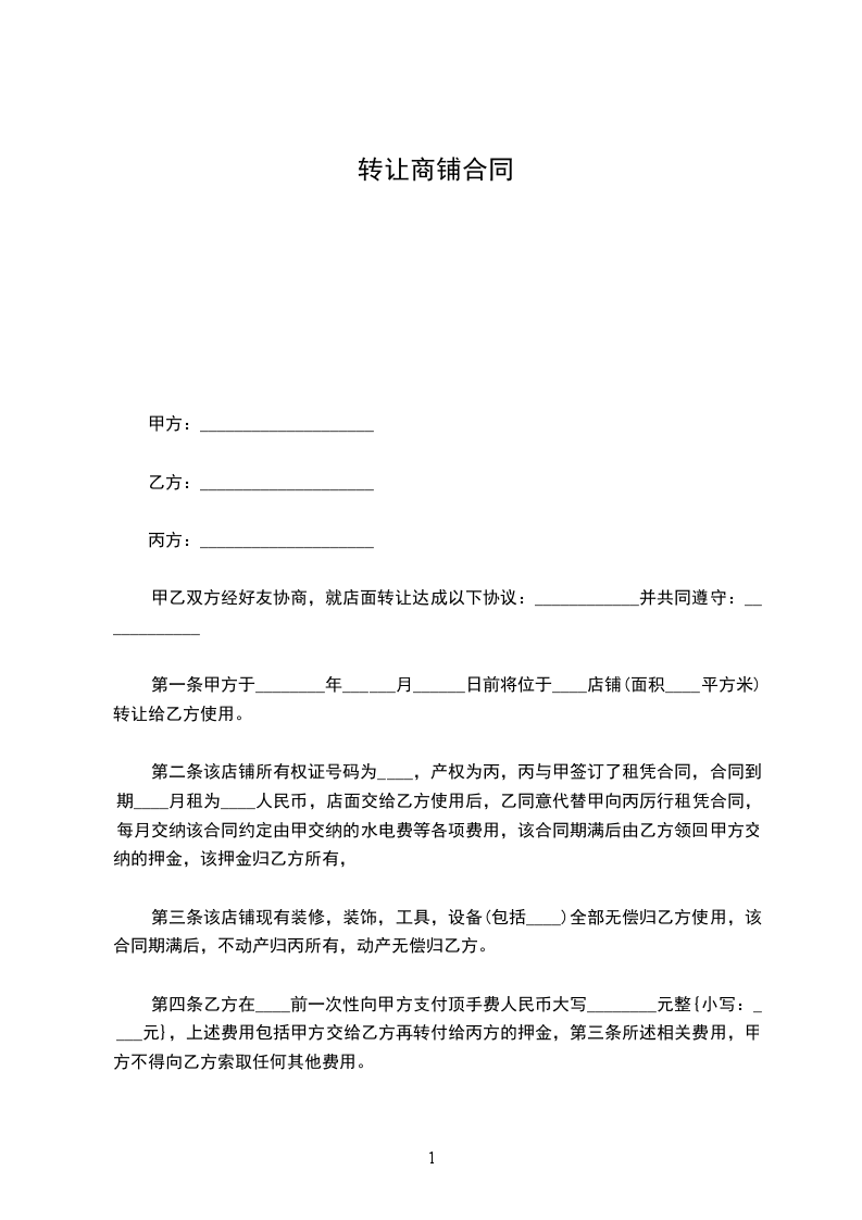 第一条甲方于20__年11月30日前将位于________________店铺(三层)转让给乙方使用.