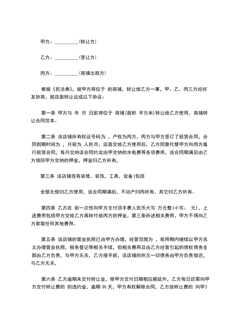 第二条该店铺产权人为丙.丙与甲方签订了租赁合同,租期到__________,月租为__________人民币.店铺交给乙方后,乙同意代替甲向丙履行该租赁合同,每月交纳租金及该合同约定由甲交纳的水电费等各项费用,该合同期满后由乙领回甲交纳的押金,该押金归乙方所有.