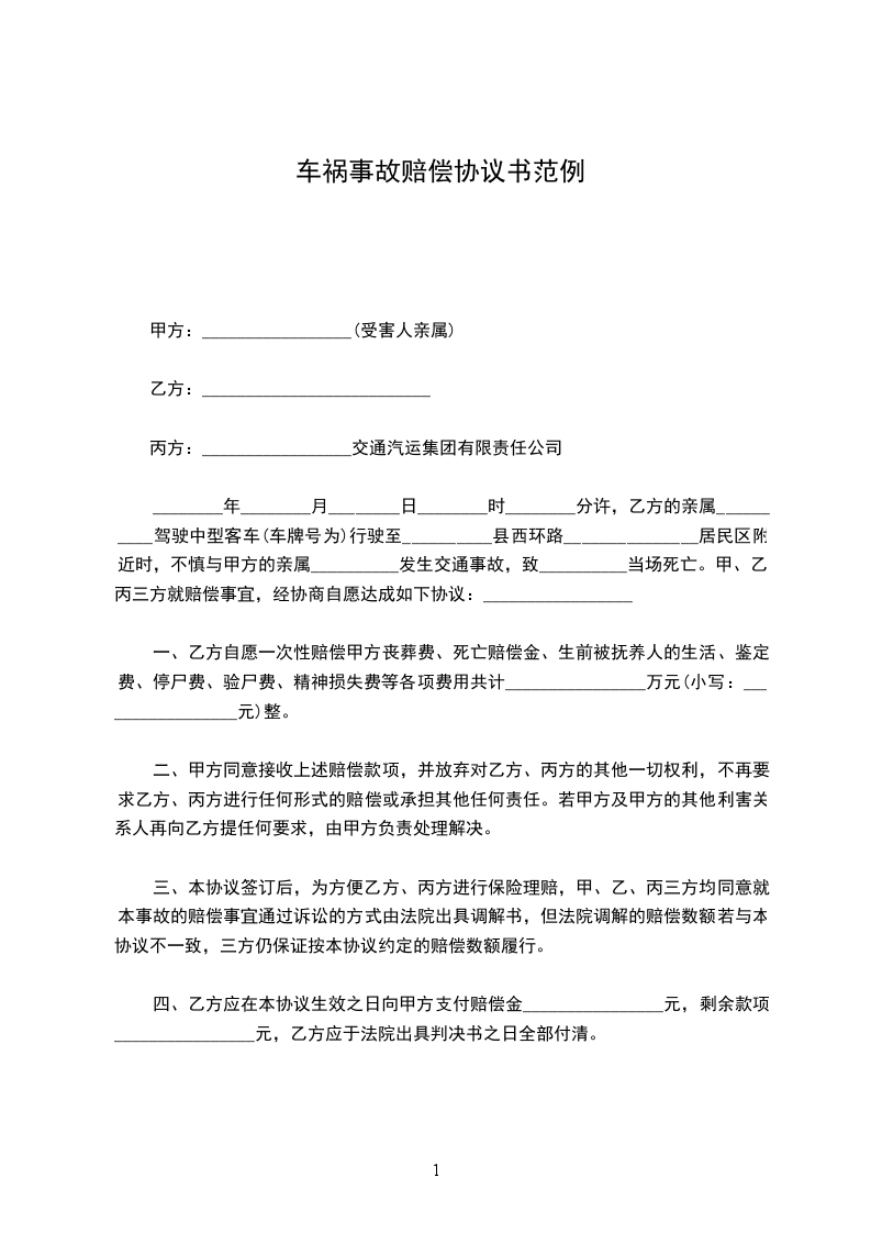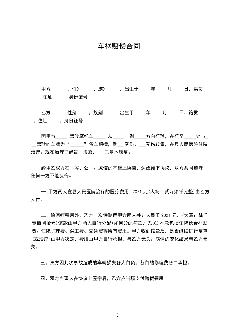一、甲方自愿赔偿给乙方各项损失共计人民币______________元(包括已经支付的______________元)。