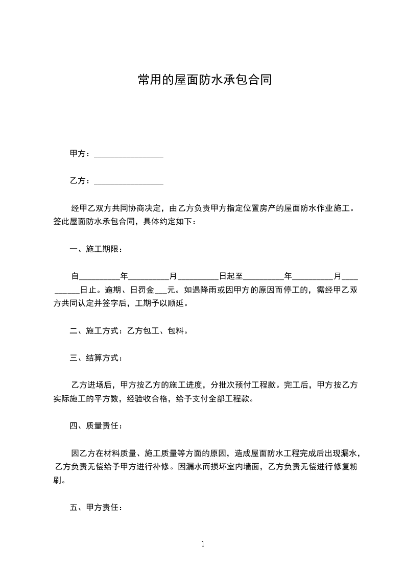 经甲乙双方共同协商决定,由乙方负责甲方指定位置房产的屋面防水作业施工。签此屋面防水承包合同,具体约定如下: