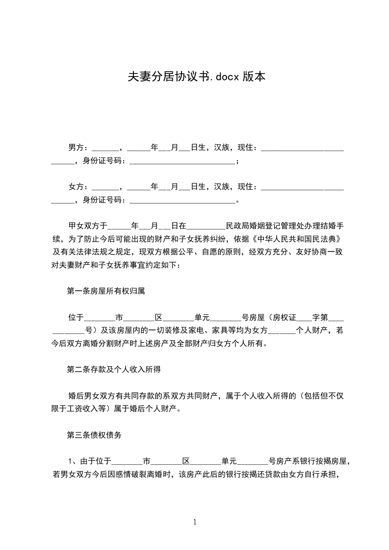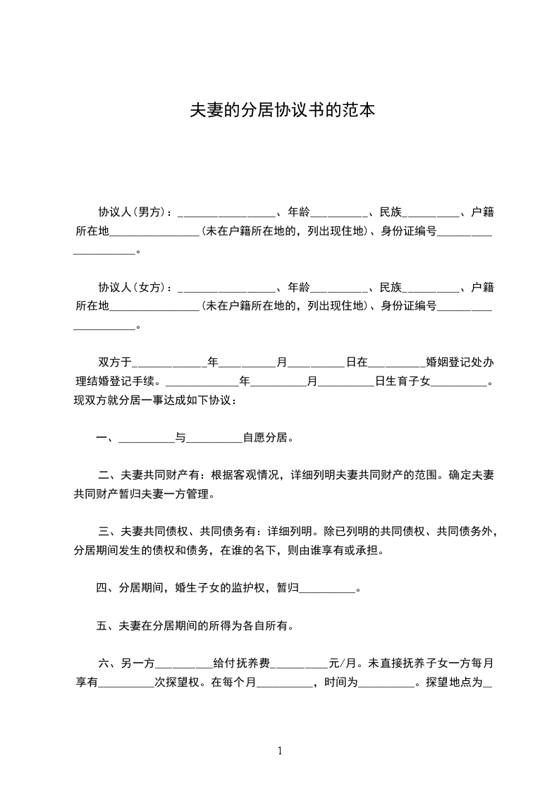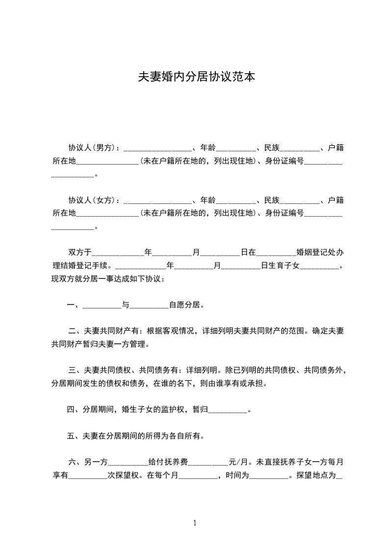 一、__________与__________自愿分居。
