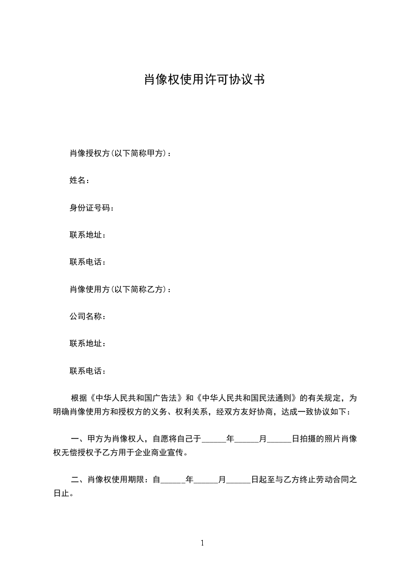 一、甲方为肖像权人,自愿将自己于______年______月______日拍摄的照片肖像权无偿授权予乙方用于企业商业宣传。