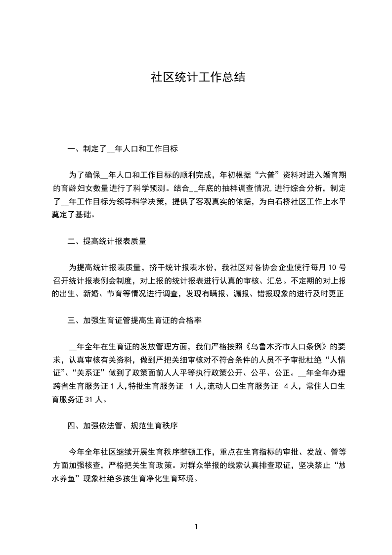 虽然我社区__年全年统计工作取得了一定的成绩,但离上级的要求还有一些距离,也存在一些不容忽视的问题。主要表现在以下几个方面:一是统计员队伍素质还有待进一步提高责任性还要进一步加强。二是各单位计生专兼干计算机应用水平不高、发挥用不强现行统计工要求相差较远。三是统计质量不高。部分单位仍然存在统计错、漏报现象。