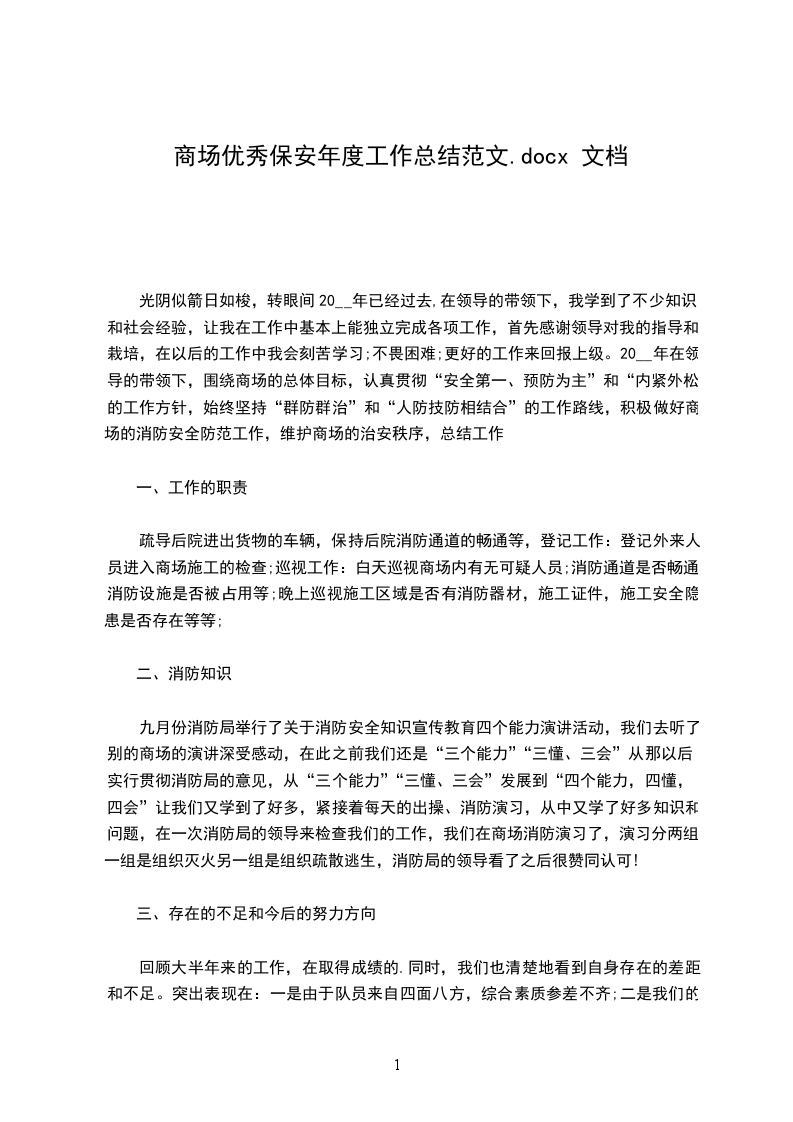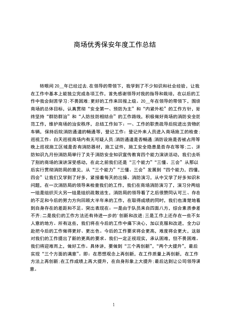 转眼间20__年已经过去,在领导的带领下,我学到了不少知识和社会经验,让我在工作中基本上能独立完成各项工作,首先感谢领导对我的指导和栽培,在以后的工作中我会刻苦学习;不畏困难;更好的工作来回报上级。20__年在领导的带领下,围绕商场的总体目标,认真贯彻“安全第一、预防为主”和“内紧外松”的工作方针,始终坚持“群防群治”和“人防技防相结合”的工作路线,积极做好商场的消防安全防范工作,维护商场的治安秩序,总结工作如下: