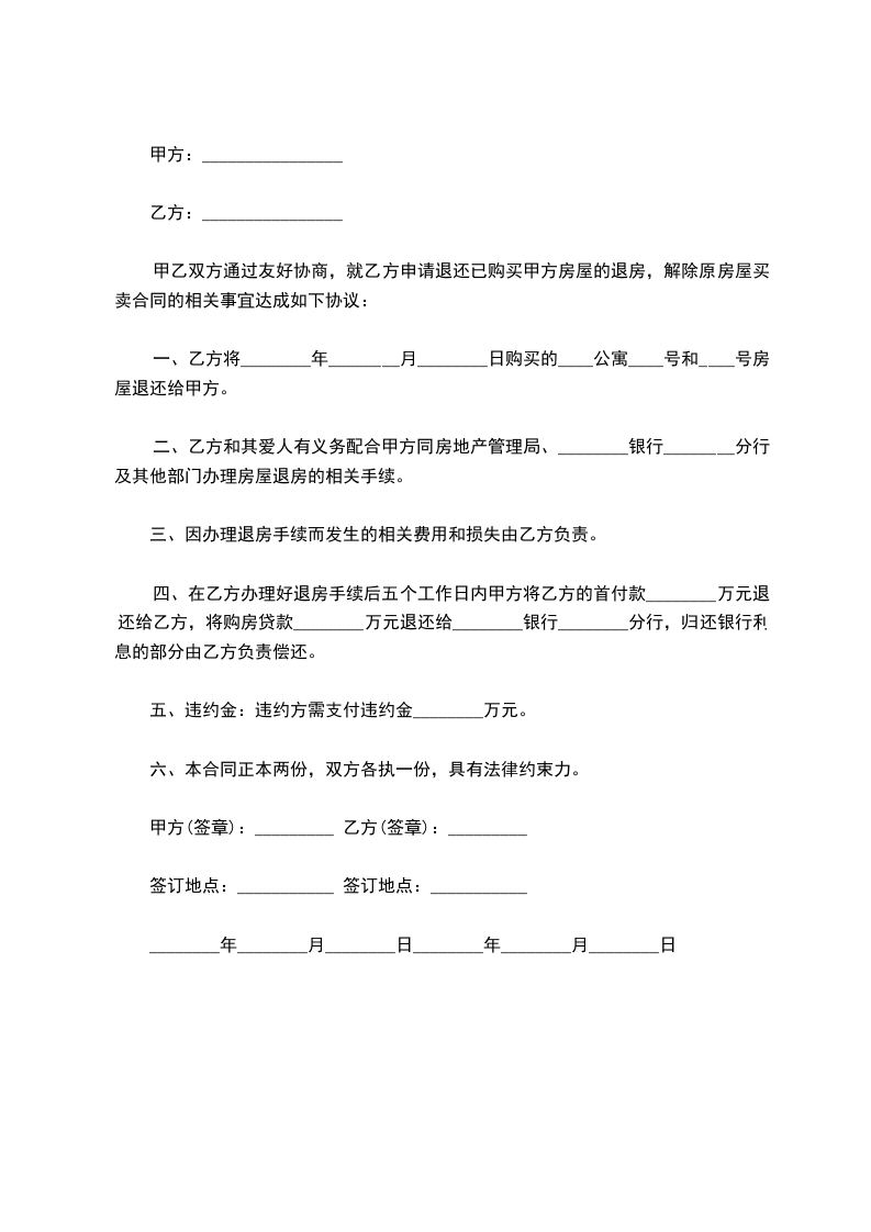 四、在乙方办理好退房手续后五个工作日内甲方将乙方的首付款________万元退还给乙方,将购房贷款________万元退还给________银行________分行,归还银行利息的部分由乙方负责偿还。