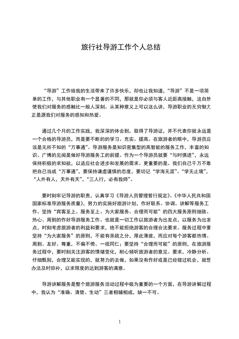 作为公司导游部的一份子,在领导和全体各部门经理、同事的共同努力下,今年的个人工作取得了一个新的台阶,作为今年初到公司到现在与公司全体同仁共同经历的这个不平凡的__年,我深深感受到公司大家庭的温暖,领导的关心,同事的帮助与支持,使我的工作能够顺利的展开,并且取得了一定的成果,自己也在不断的实践当中取得了个人的工作上的突破和成长,这是和全体同事的共同努力所不能分开的,当然面对工作当中出现的一些压力和工作上的失误,我深刻的意识到,只有正视自己的不足,勇开拓创新,发挥全体同事的聪明智慧,才能解决工作当中的一些疑难,和不必要的困扰,回顾__年,是不平凡的一年,是充满希望的一年,也是充满挑战和压力的一年,作人来说,我总结了一年来个人业务的详细情况,出差共计12次,参与大小会议共计8次,带团共计3次,接待1次。希望自己在新的一年里,工作顺利,能够有更多的机会参与到公司的各个大小会议,旅游接待当中去,为公司尽自己的一份力量。