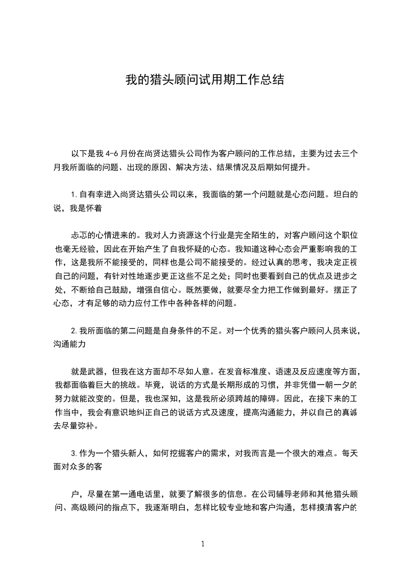 忐忑的心情进来的。我对人力资源这个行业是完全陌生的,对客户顾问这个职位也毫无经验,因此在开始产生了自我怀疑的心态。我知道这种心态会严重影响我的工作,这是我所不能接受的,同样也是公司不能接受的。经过认真的思考,我决定正视自己的问题,有针对性地逐步更正这些不足之处;同时也要看到自己的优点及进步之处,不断给自己鼓励,增强自信心。既然要做,就要尽全力把工作做到最好。摆正了心态,才有足够的动力应付工作中各种各样的问题。