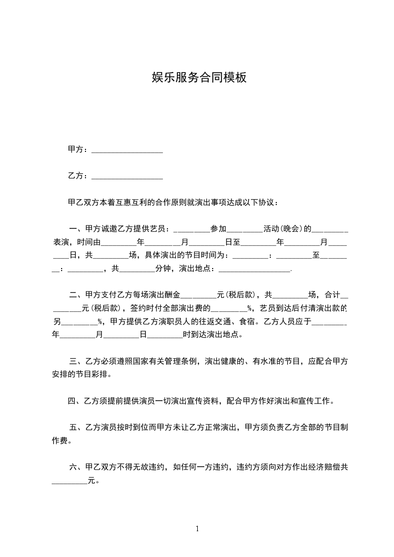 一、甲方诚邀乙方提供艺员:_________参加_________活动(晚会)的_________表演,时间由_________年_________月_________日至_________年_________月_________日,共_________场,具体演出的节目时间为:_________:_________至_________:_________,共_________分钟,演出地点:__________________.