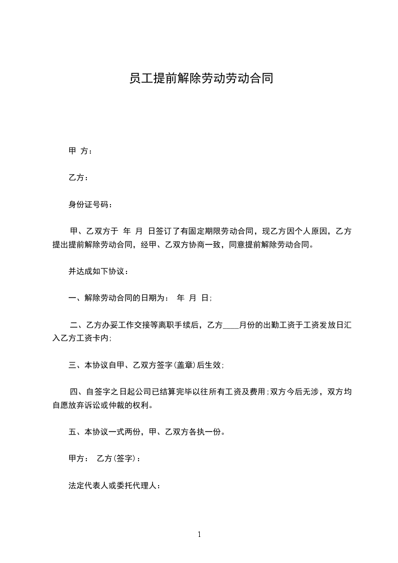 1、 自_________________年_________________月_________________日起,解除双方签订的劳动合同,双方的权利义务随之终止;