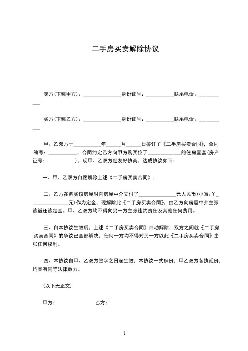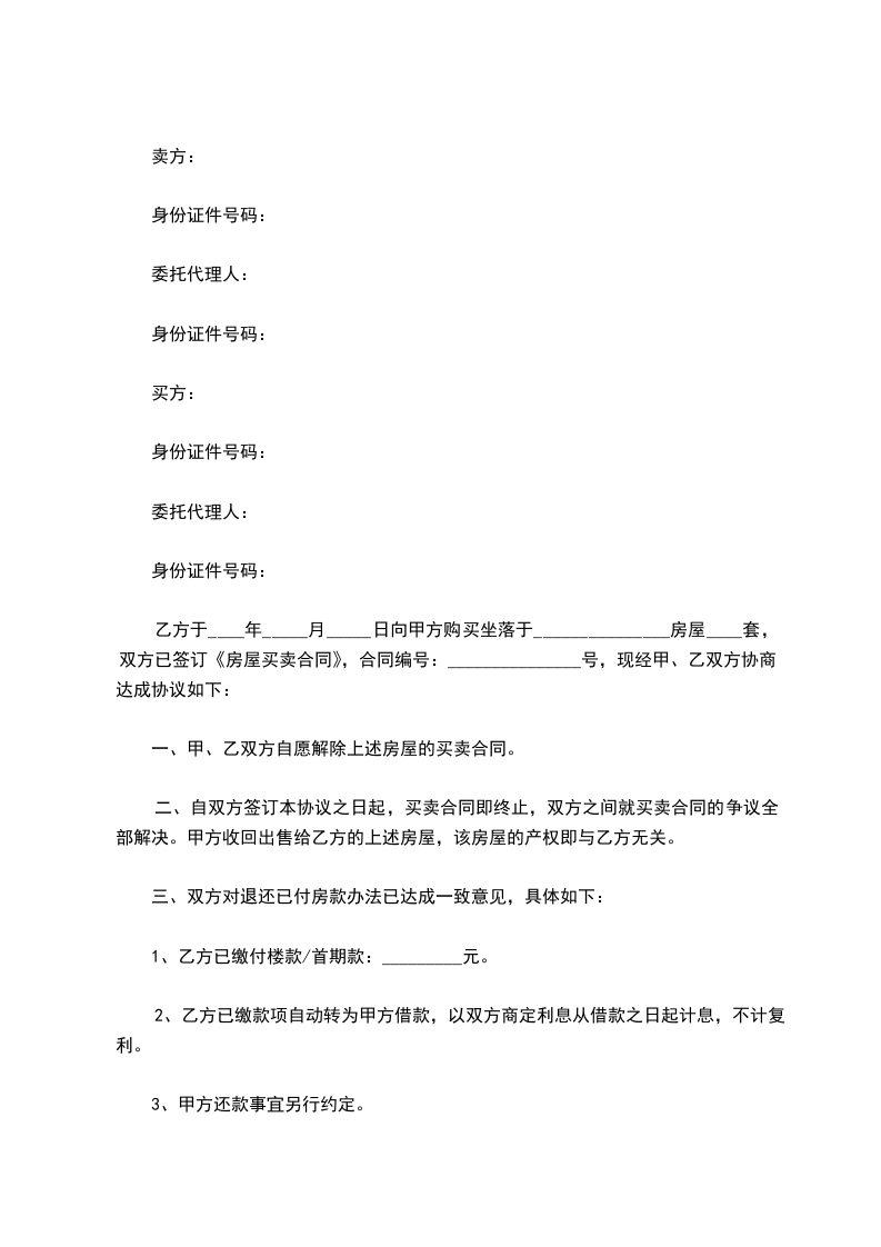 一、甲、乙双方自愿解除上述购房合同。自本协议生效之日起,双方之间就该购房合同的争议全部解决。