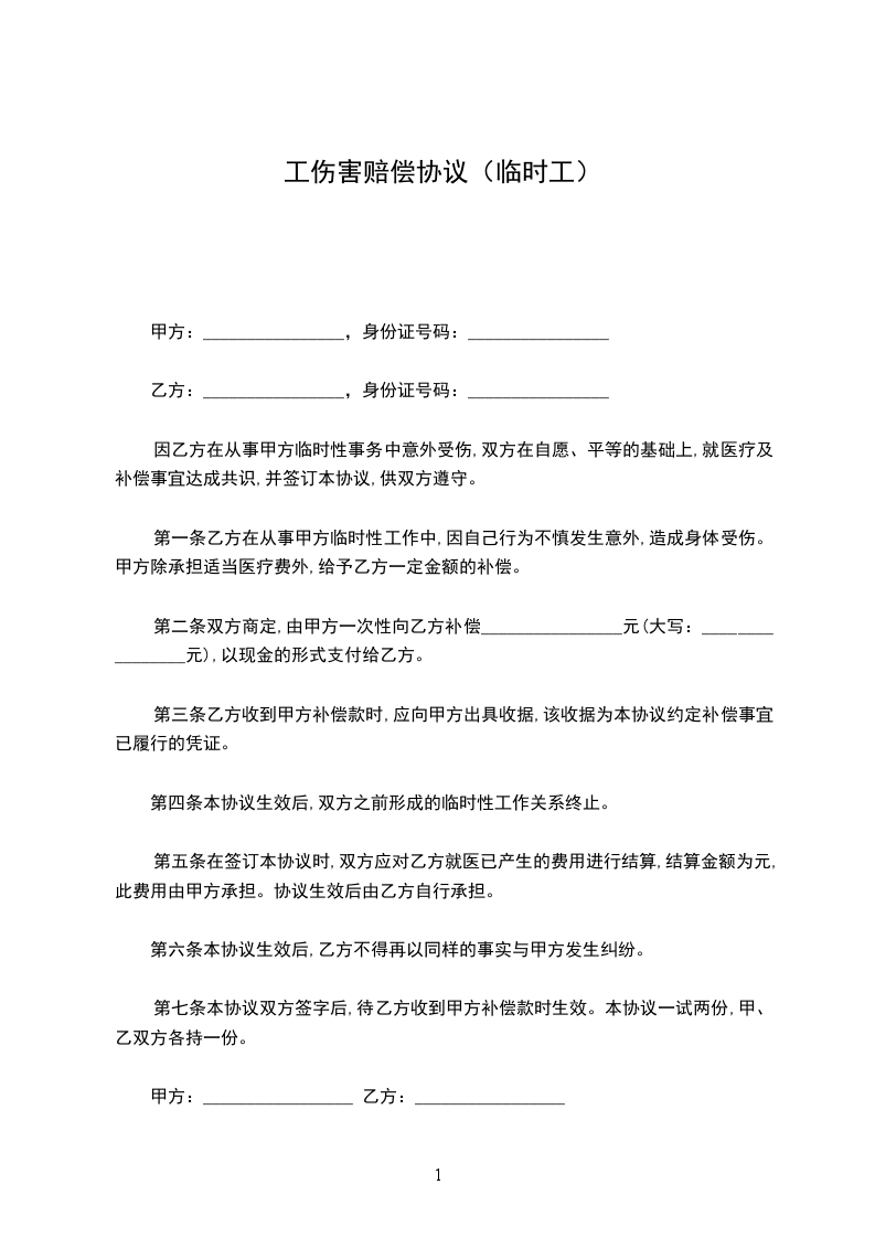 第一条乙方在从事甲方临时性工作中,因自己行为不慎发生意外,造成身体受伤。甲方除承担适当医疗费外,给予乙方一定金额的补偿。