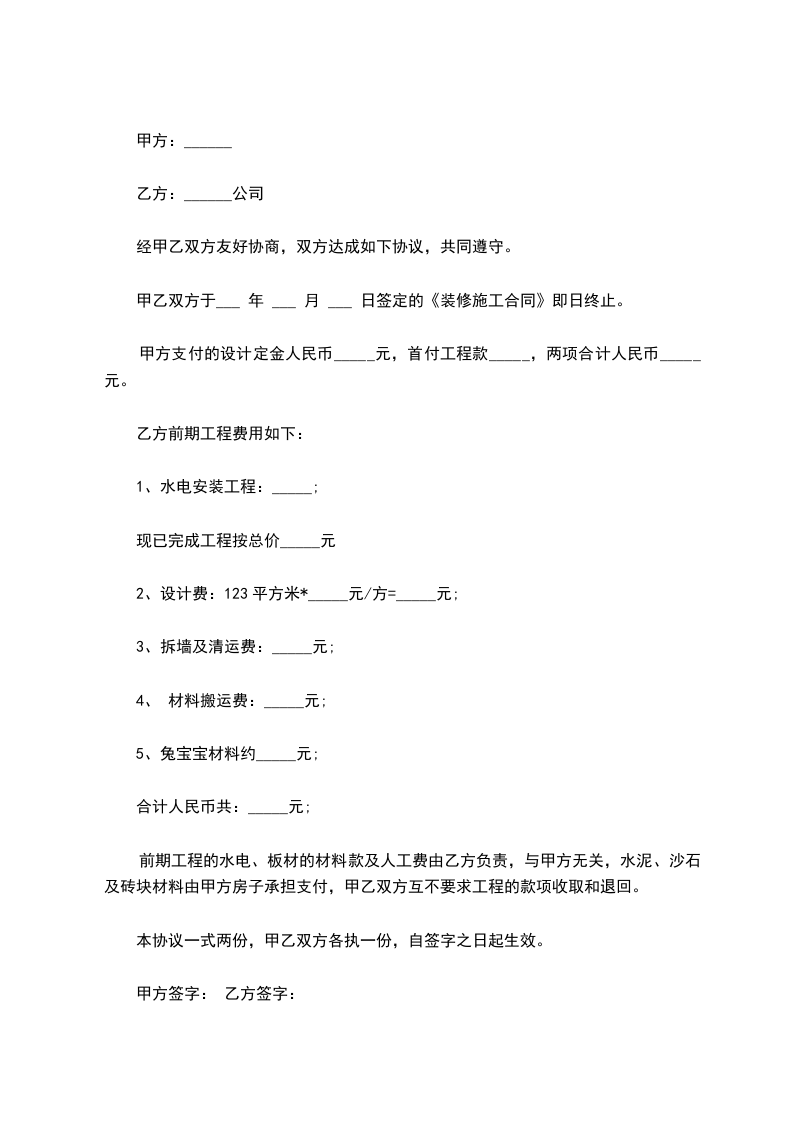 甲乙双方于___ 年 ___ 月 ___ 日签定的《装修施工合同》即日终止。