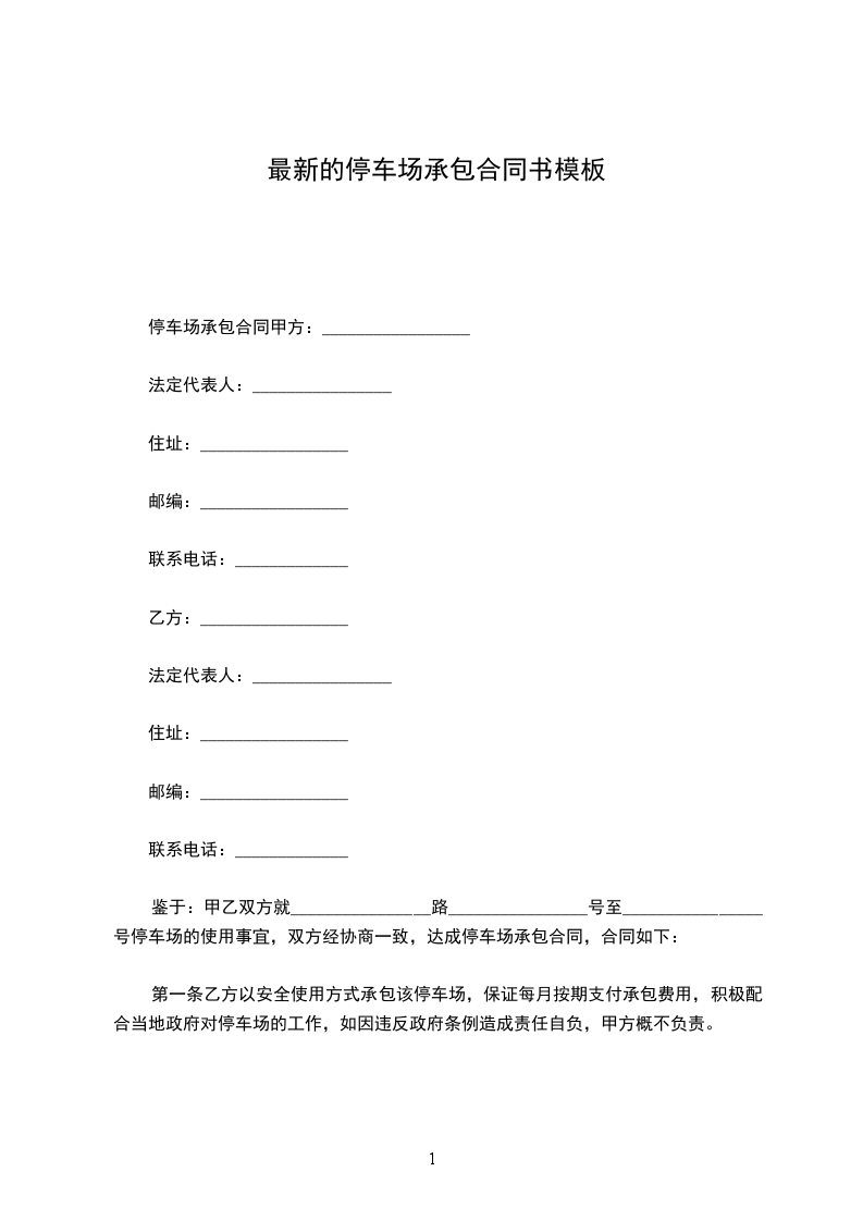鉴于:甲乙双方就________________路________________号至________________号停车场的使用事宜,双方经协商一致,达成停车场承包合同,合同如下: