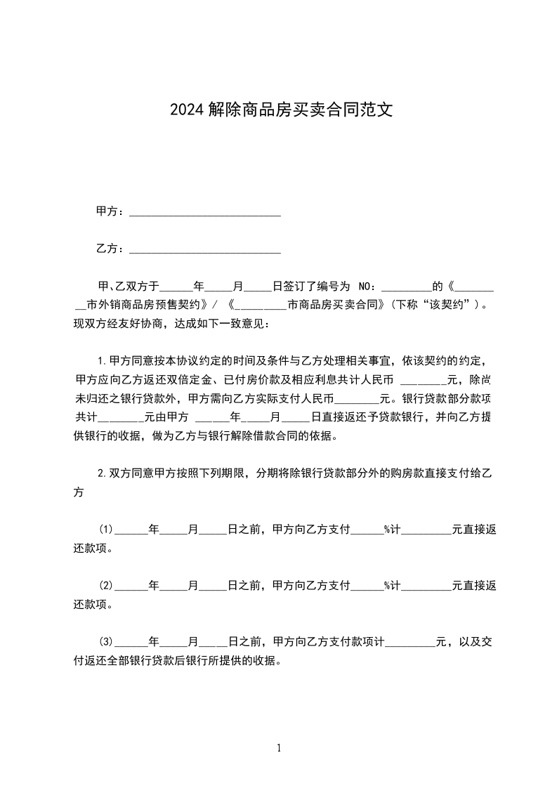 1.甲方同意按本协议约定的时间及条件与乙方处理相关事宜,依该契约的约定,甲方应向乙方返还双倍定金、已付房价款及相应利息共计人民币 ________元,除尚未归还之银行贷款外,甲方需向乙方实际支付人民币________元。银行贷款部分款项共计________元由甲方 ______年_____月_____日直接返还予贷款银行,并向乙方提供银行的收据,做为乙方与银行解除借款合同的依据。
