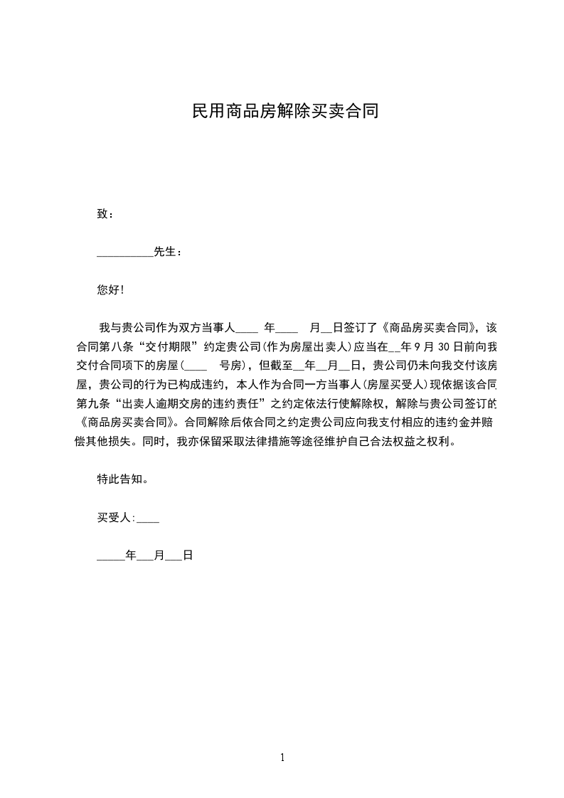 5.甲方向乙方支付全款计_________元之后,并且双方签订解除该契约的文件生效后,乙方应授权甲方至_________市国土资源与房屋管理局(下称“房地局”)办理该契约注销登记手续之全部所需文件(包括签署递交房地局的解约协议、返还甲方开具的付款票据和合同等)。