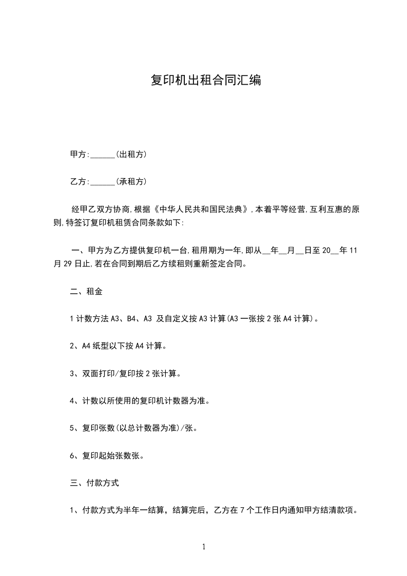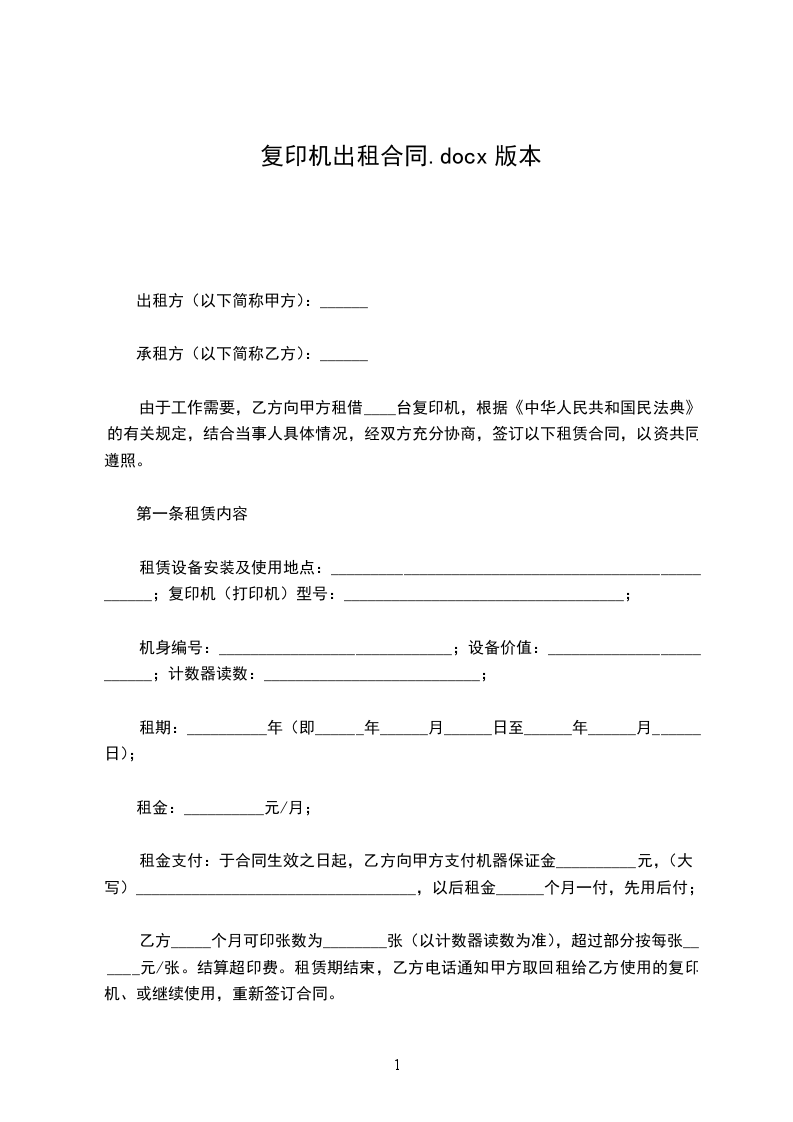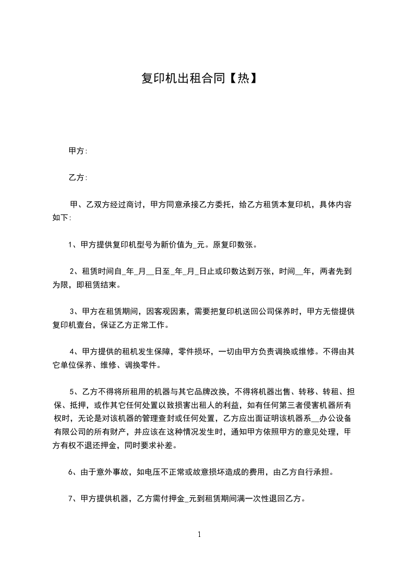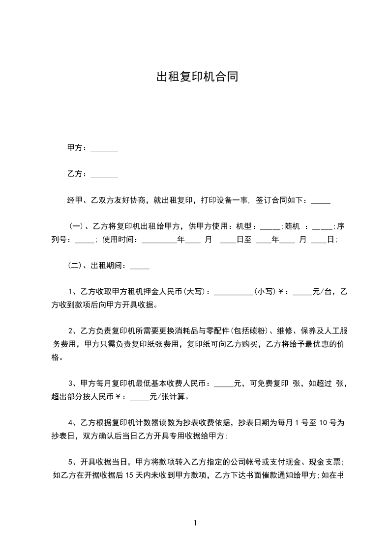 1、甲方将_____复印机___台出租给乙方使用,租期为____年(从___年 ___月___日至___年___月___日止)甲方收取乙方复印机押金____元,合同期满后将其押金无息退还给乙方。