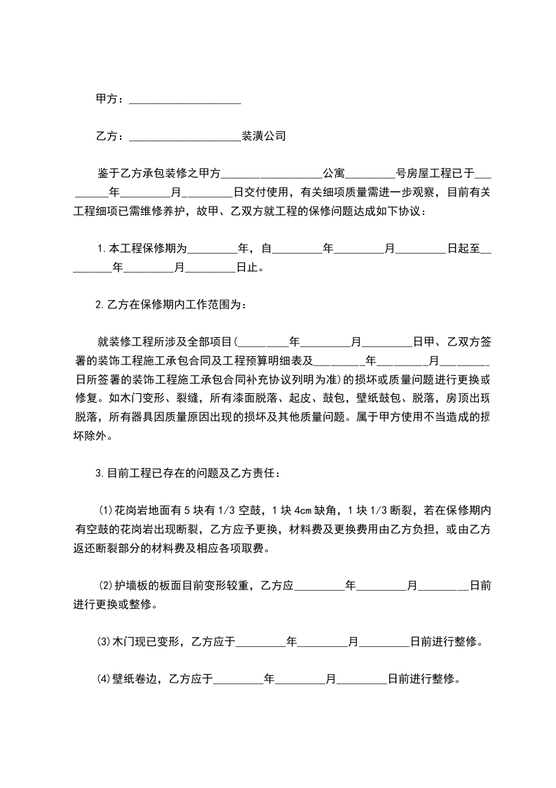 鉴于乙方承包装修之甲方__________________公寓_________号房屋工程已于_________年_________月_________日交付使用,有关细项质量需进一步观察,目前有关工程细项已需维修养护,故甲、乙双方就工程的保修问题达成如下协议: