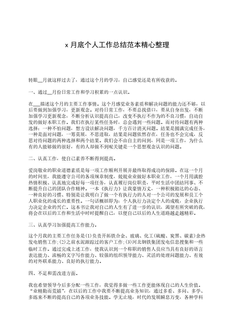 在___描述这个月的主要工作事情。这个月感觉业务素质和解决问题的能力还不够,以后要做到加强学习,更新观念。对待日常工作,不要总找借口,要从自身出发,不断加强学习更新观念,不断分析认识提高自己,改变不执行不作为的不良习惯,自动自发的做好本职工作。我们在执行某些任务时,总会遇到一些问题。而对待问题有两种选择:一种不怕问题,想方设法解决问题,千方百计消灭问题。结果是圆满完成任务,一种是面对问题,一筹莫展,不思进取,结果是问题依然存在,任务也不会完成,反思对待问题的两种选择和两个结果。我们会不由自主的问到,同是一项工作,为什么有的人能够做的很好,有的人却做不到呢关键是一个思想观念认识的问题。
