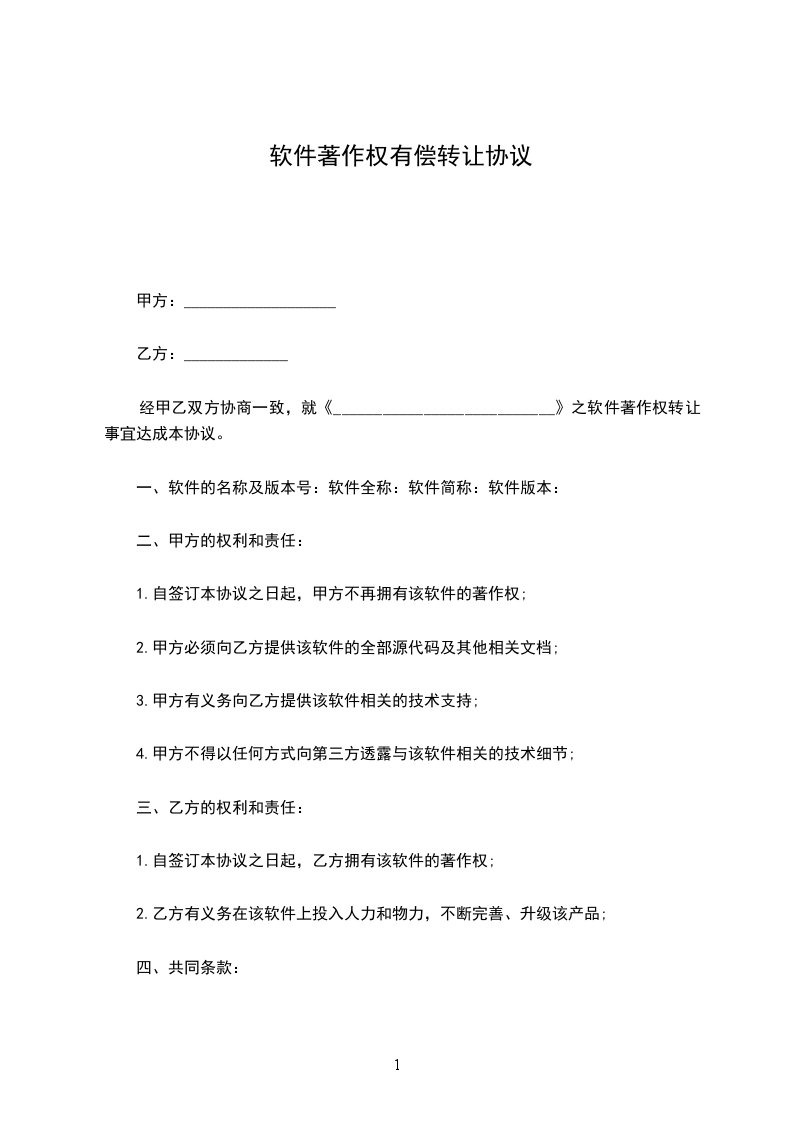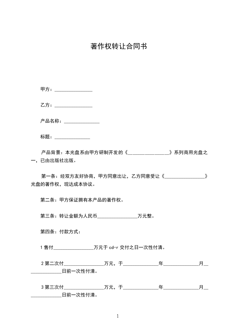 第一条:经双方友好协商,甲方同意出让,乙方同意受让《_________________》光盘的著作权,现达成本协议。