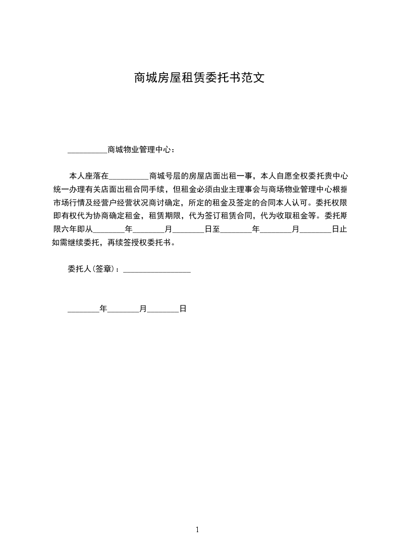 本人座落在__________商城号层的房屋店面出租一事,本人自愿全权委托贵中心统一办理有关店面出租合同手续,但租金必须由业主理事会与商场物业管理中心根据市场行情及经营户经营状况商讨确定,所定的租金及签定的合同本人认可。委托权限:即有权代为协商确定租金,租赁期限,代为签订租赁合同,代为收取租金等。委托期限六年即从________年________月________日至________年________月________日止,如需继续委托,再续签授权委托书。