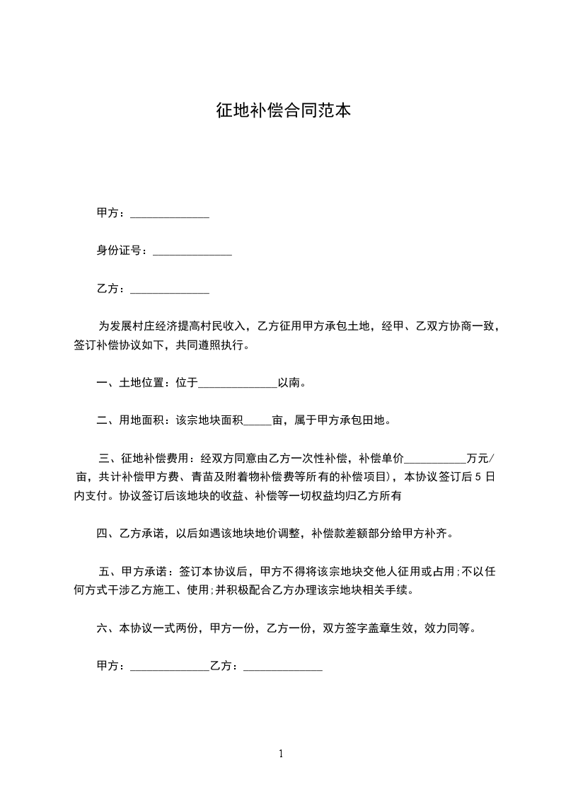 三、征地补偿费用:经双方同意由乙方一次性补偿,补偿单价___________万元/亩,共计补偿甲方费、青苗及附着物补偿费等所有的补偿项目),本协议签订后5日内支付。协议签订后该地块的收益、补偿等一切权益均归乙方所有