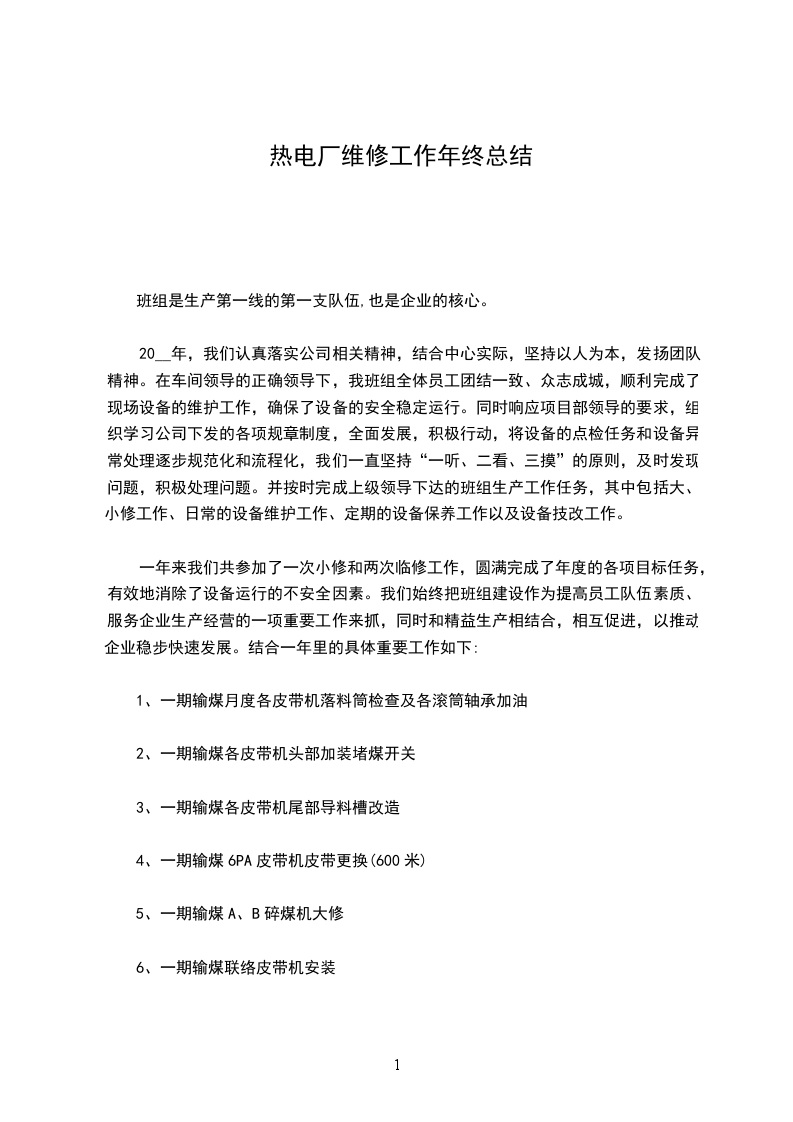 20__年,我们认真落实公司相关精神,结合中心实际,坚持以人为本,发扬团队精神。在车间领导的正确领导下,我班组全体员工团结一致、众志成城,顺利完成了现场设备的维护工作,确保了设备的安全稳定运行。同时响应项目部领导的要求,组织学习公司下发的各项规章制度,全面发展,积极行动,将设备的点检任务和设备异常处理逐步规范化和流程化,我们一直坚持“一听、二看、三摸”的原则,及时发现问题,积极处理问题。并按时完成上级领导下达的班组生产工作任务,其中包括大、小修工作、日常的设备维护工作、定期的设备保养工作以及设备技改工作。