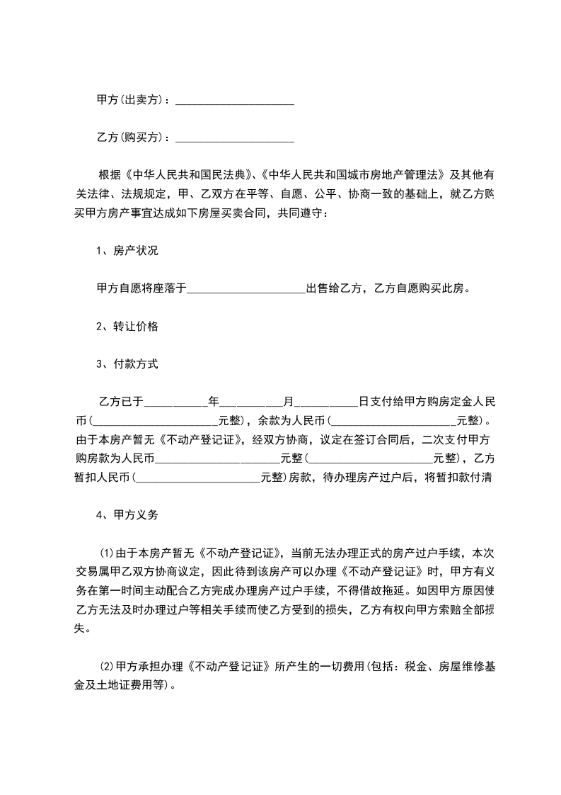 (1)由于本房产暂无《不动产登记证》,当前无法办理正式的房产过户手续,本次交易属甲乙双方协商议定,因此待到该房产可以办理《不动产登记证》时,甲方有义务在第一时间主动配合乙方完成办理房产过户手续,不得借故拖延。如因甲方原因使乙方无法及时办理过户等相关手续而使乙方受到的损失,乙方有权向甲方索赔全部损失。