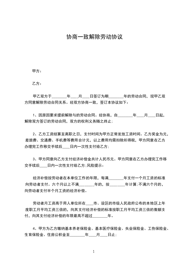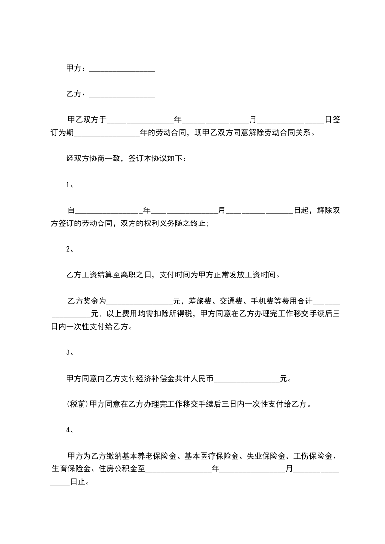 甲乙双方于_________________年_________________月_________________日签订为期_________________年的劳动合同,现甲乙双方同意解除劳动合同关系。经双方协商一致,签订本协议如下:
