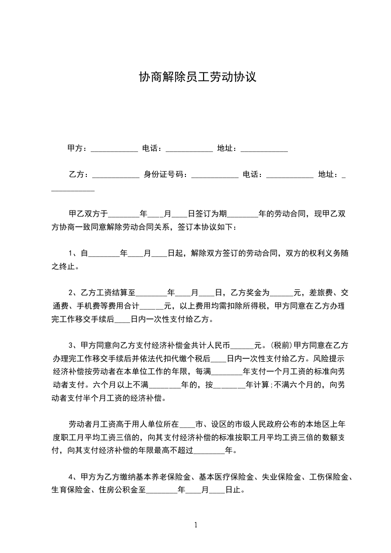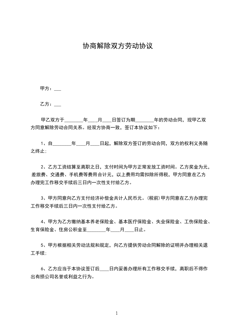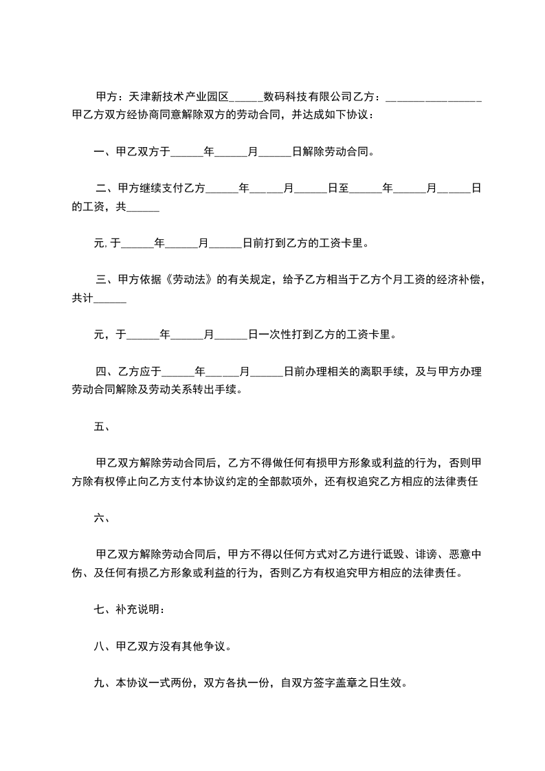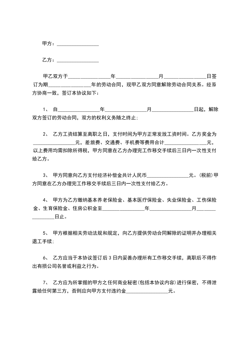 1、 自_________________年_________________月_________________日起,解除双方签订的劳动合同,双方的权利义务随之终止;