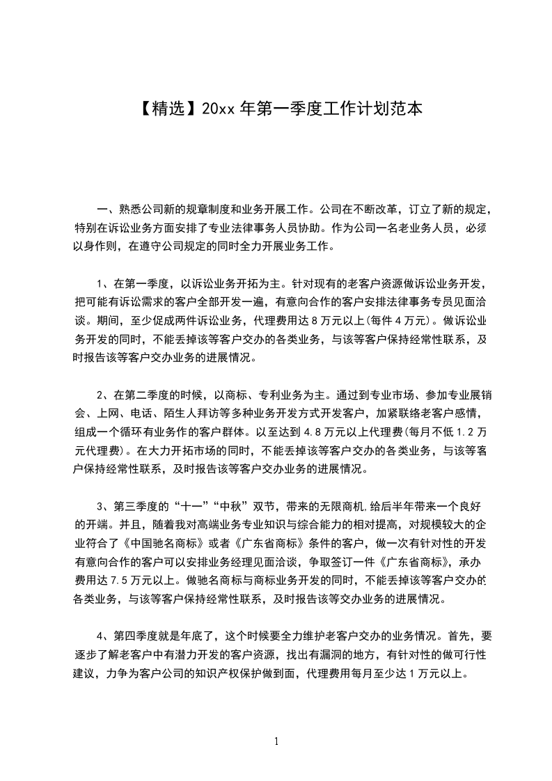 1、在第一季度,以诉讼业务开拓为主。针对现有的老客户资源做诉讼业务开发,把可能有诉讼需求的客户全部开发一遍,有意向合作的客户安排法律事务专员见面洽谈。期间,至少促成两件诉讼业务,代理费用达_万元以上(每件_万元)。做诉讼业务开发的同时,不能丢掉该等客户交办的各类业务,与该等客户保持经常性联系,及时报告该等客户交办业务的进展情况。