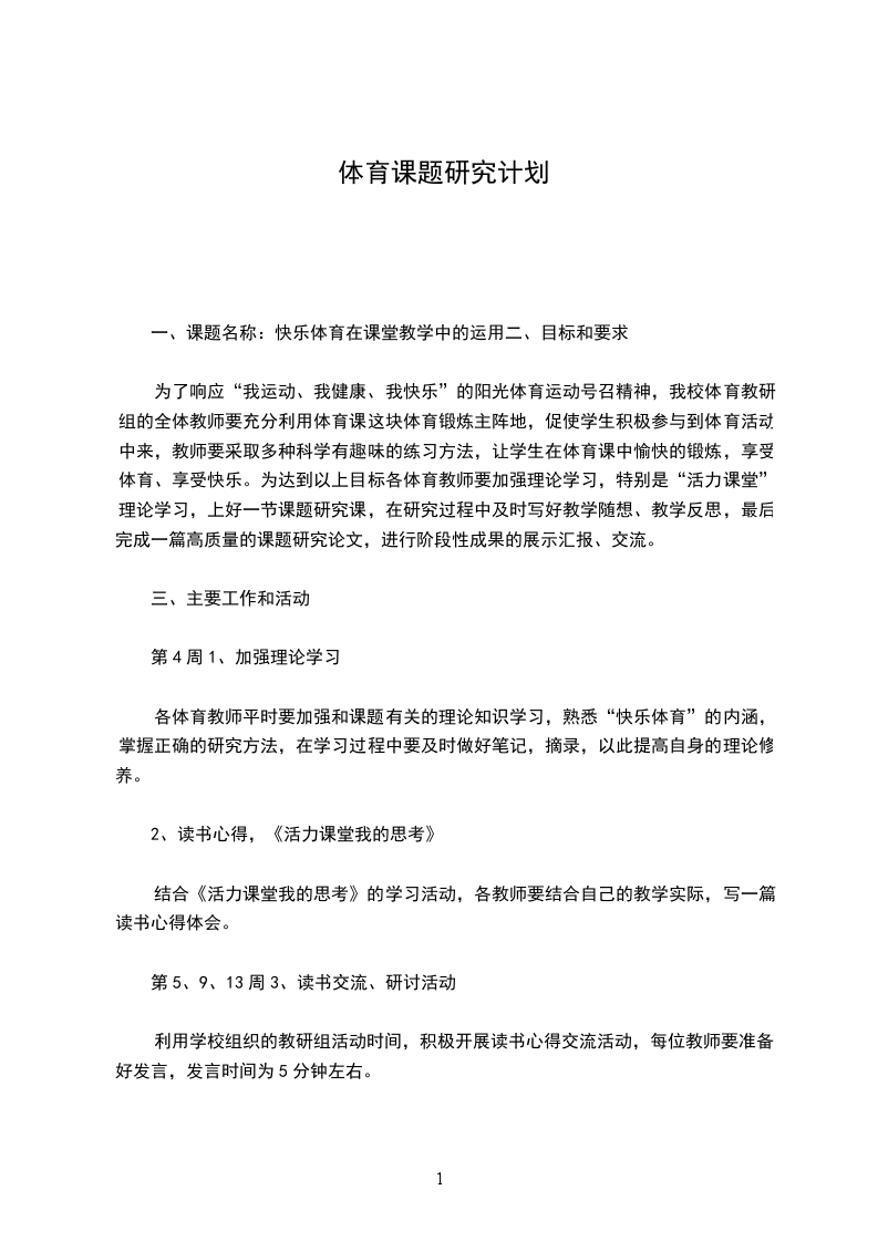为了响应“我运动、我健康、我快乐”的阳光体育运动号召精神,我校体育教研组的全体教师要充分利用体育课这块体育锻炼主阵地,促使学生积极参与到体育活动中来,教师要采取多种科学有趣味的练习方法,让学生在体育课中愉快的锻炼,享受体育、享受快乐。为达到以上目标各体育教师要加强理论学习,特别是“活力课堂”理论学习,上好一节课题研究课,在研究过程中及时写好教学随想、教学反思,最后完成一篇高质量的课题研究论文,进行阶段性成果的展示汇报、交流。