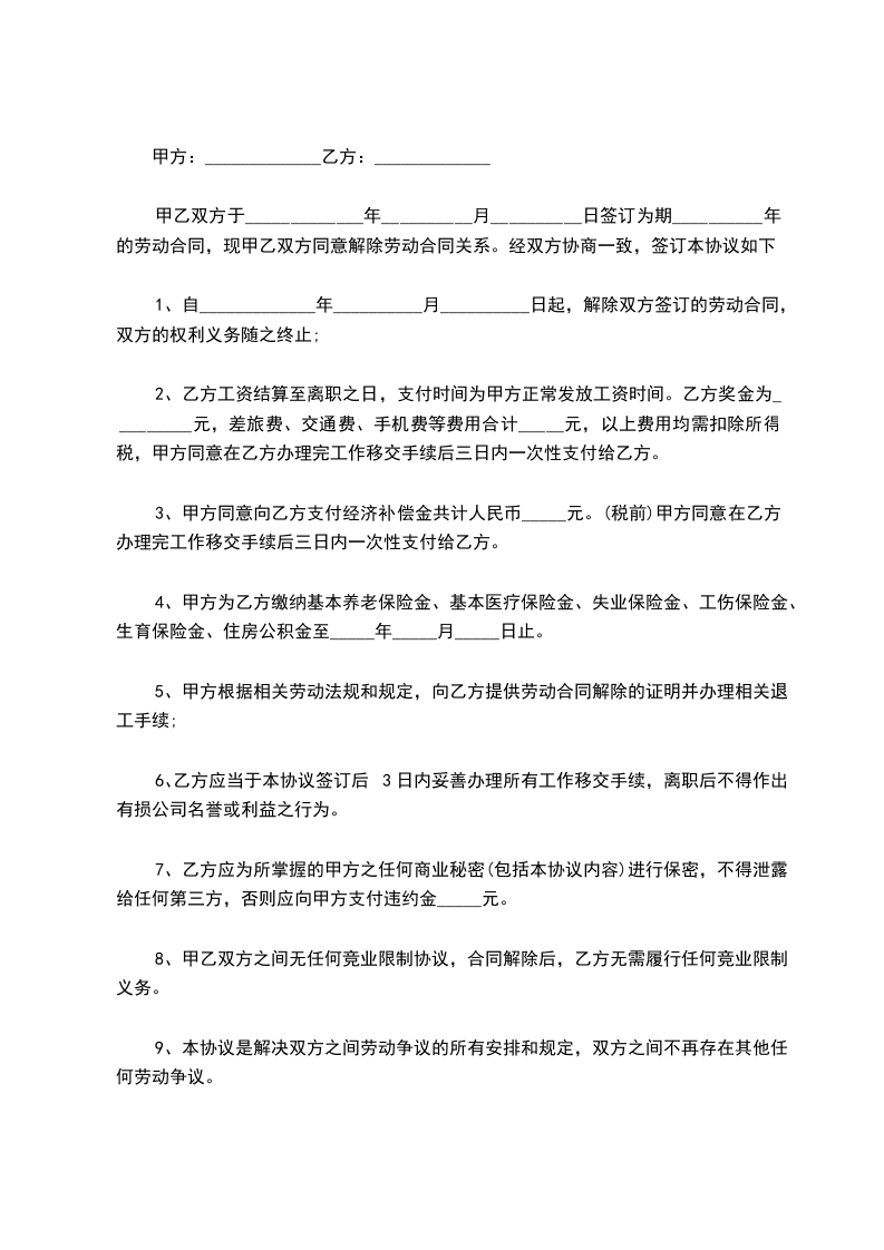 甲乙双方于_____________年__________月__________日签订为期__________年的劳动合同,现甲乙双方同意解除劳动合同关系。经双方协商一致,签订本协议如下: