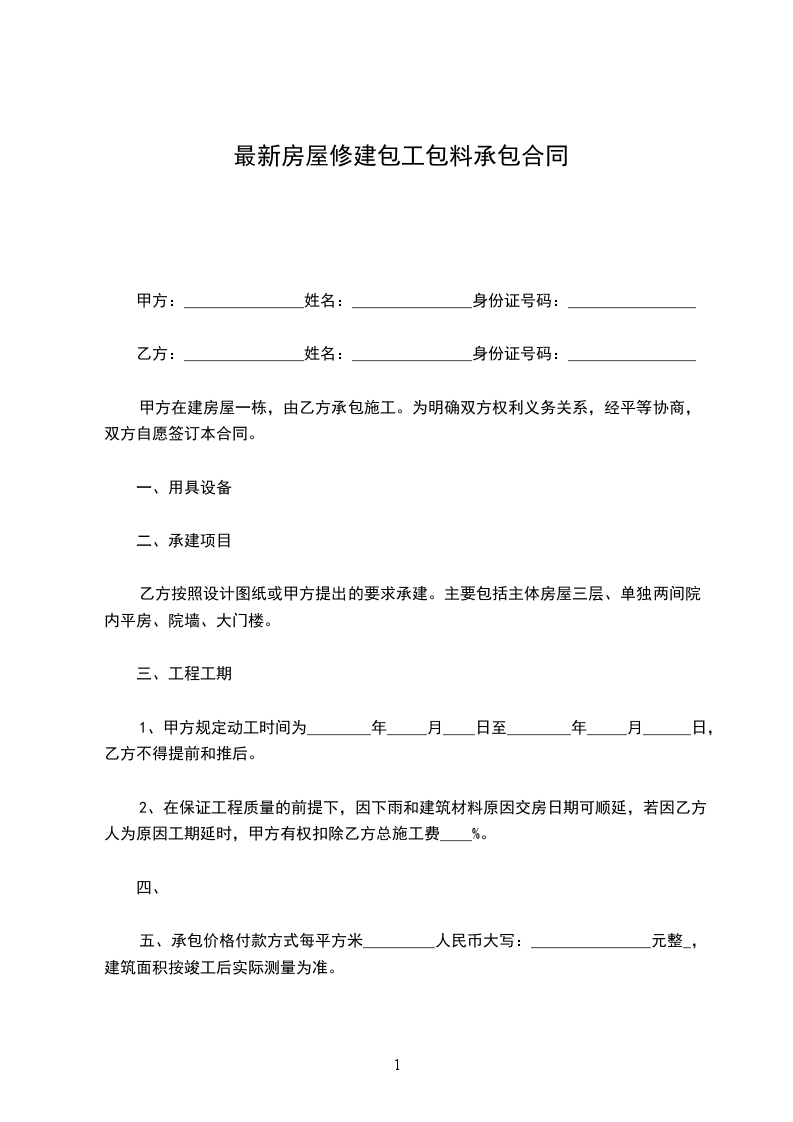 五、承包价格付款方式每平方米_________人民币大写:_______________元整_,建筑面积按竣工后实际测量为准。