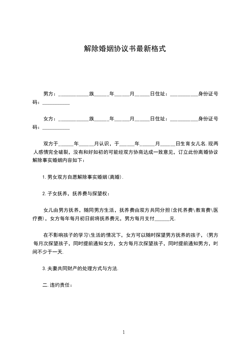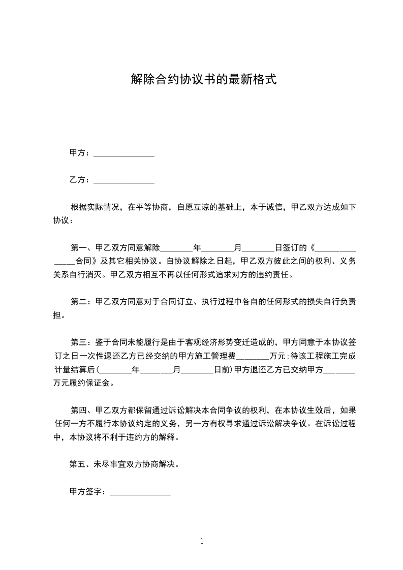 1、自_____________年__________月__________日起,解除双方签订的劳动合同,双方的权利义务随之终止;