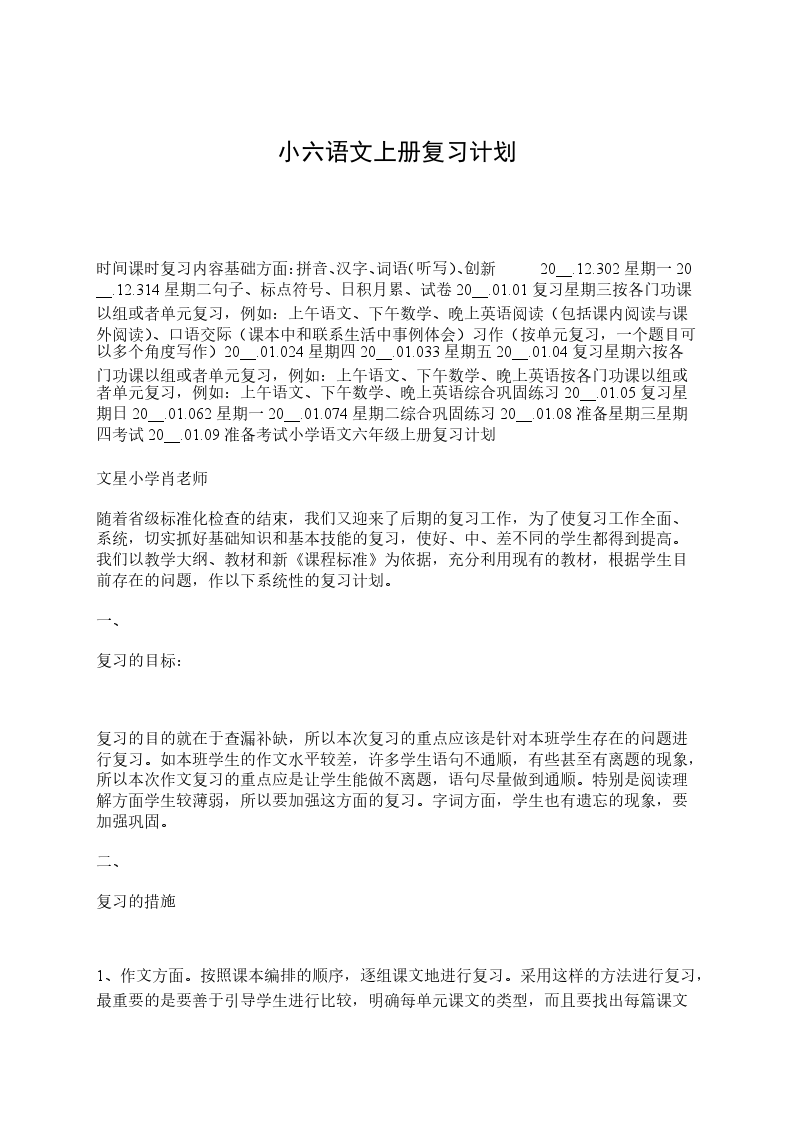 时间课时复习内容基础方面:拼音、汉字、词语(听写)、创新20__.12.302星期一20__.12.314星期二句子、标点符号、日积月累、试卷20__.01.01复习星期三按各门功课以组或者单元复习,例如:上午语文、下午数学、晚上英语阅读(包括课内阅读与课外阅读)、口语交际(课本中和联系生活中事例体会)习作(按单元复习,一个题目可以多个角度写作)20__.01.024星期四20__.01.033星期五20__.01.04复习星期六按各门功课以组或者单元复习,例如:上午语文、下午数学、晚上英语按各门功课以组或者单元复习,例如:上午语文、下午数学、晚上英语综合巩固练习20__.01.05复习星期日20__.01.062星期一20__.01.074星期二综合巩固练习20__.01.08准备星期三星期四考试20__.01.09准备考试小学语文六年级上册复习计划