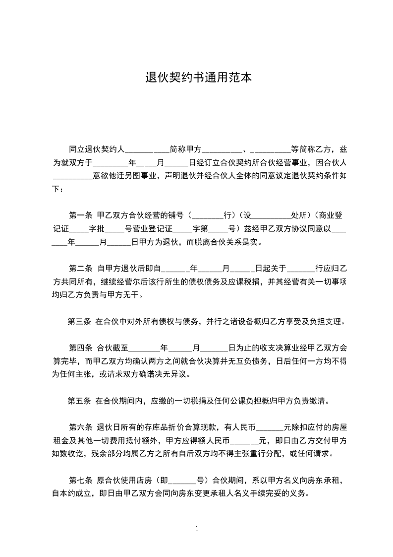 第一条 甲乙双方合伙经营的铺号(________行)(设__________处所)(商业登记证_____字批_____号营业登记证_____字第_____号)兹经甲乙双方协议同意以________年______月______日甲方为退伙,而脱离合伙关系是实。