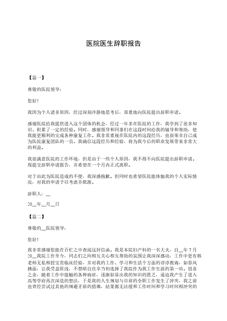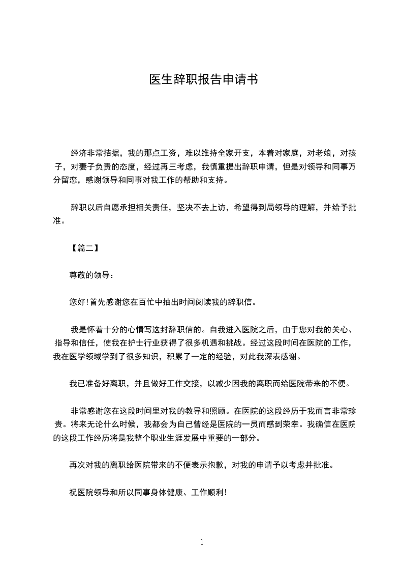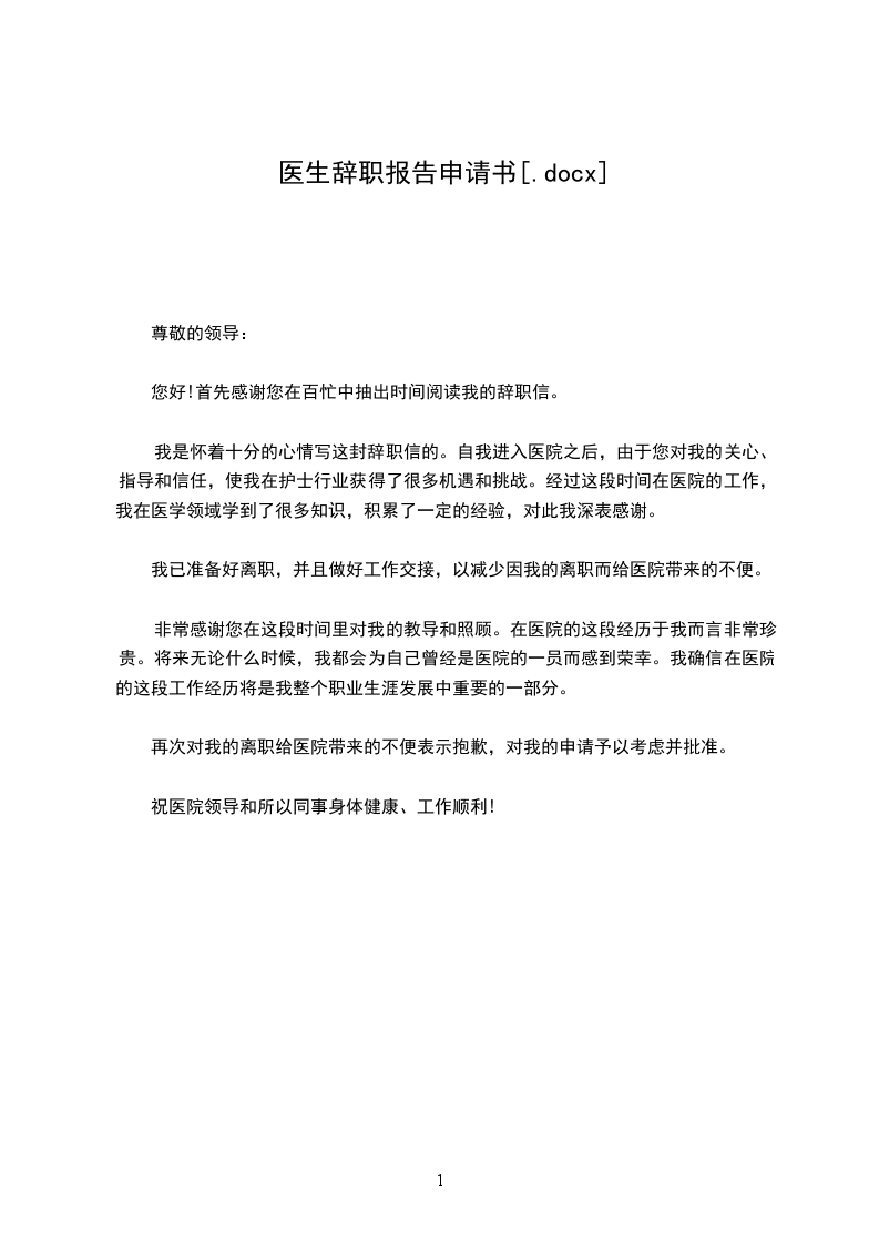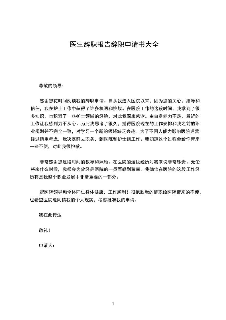 我是怀着十分的心情写这封辞职信的。自我进入医院之后,由于您对我的关心、指导和信任,使我在护士行业获得了很多机遇和挑战。经过这段时间在医院的工作,我在医学领域学到了很多知识,积累了一定的经验,对此我深表感谢。