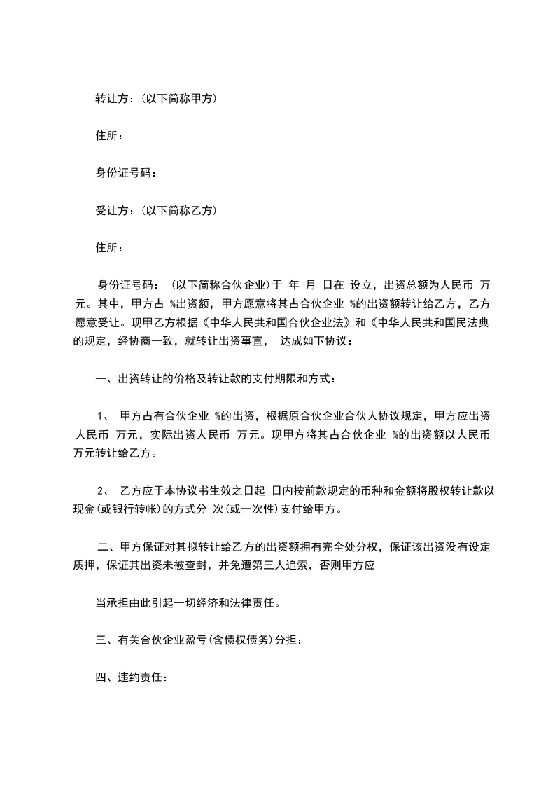 身份证号码: (以下简称合伙企业)于 年 月 日在 设立,出资总额为人民币 万元。其中,甲方占 %出资额,甲方愿意将其占合伙企业 %的出资额转让给乙方,乙方愿意受让。现甲乙方根据《中华人民共和国合伙企业法》和《中华人民共和国民法典》的规定,经协商一致,就转让出资事宜, 达成如下协议: