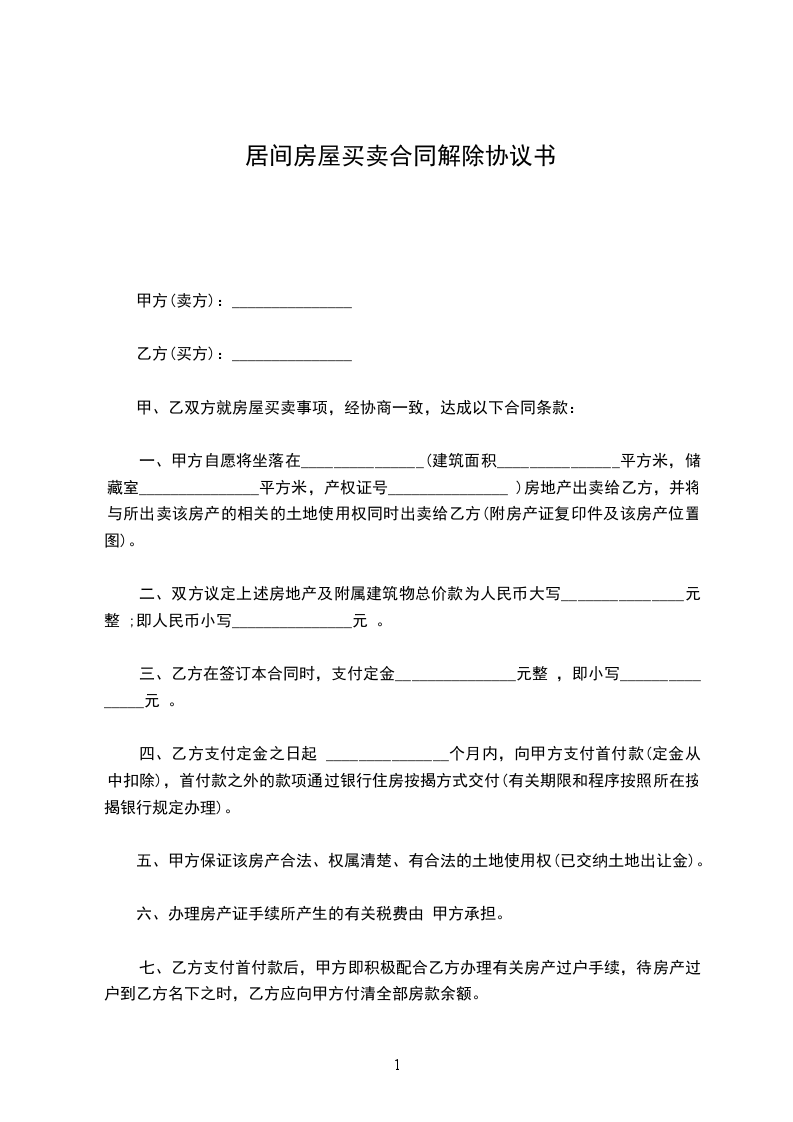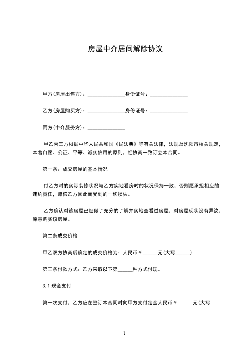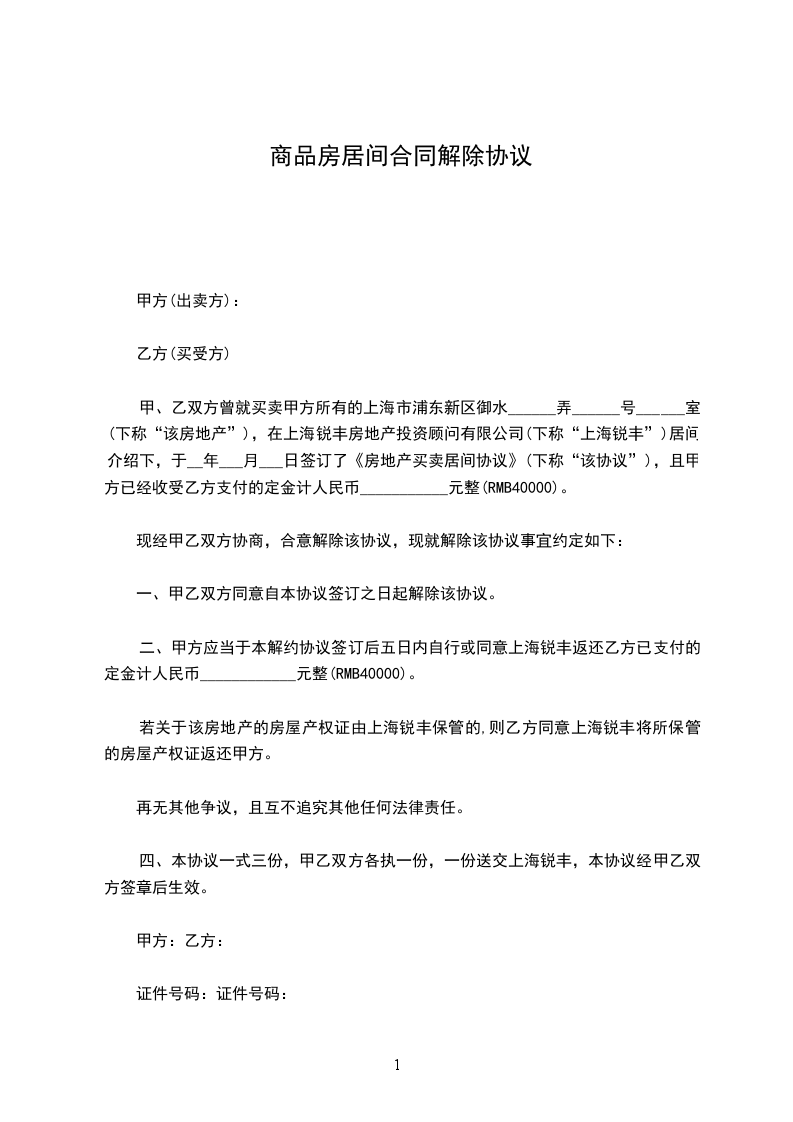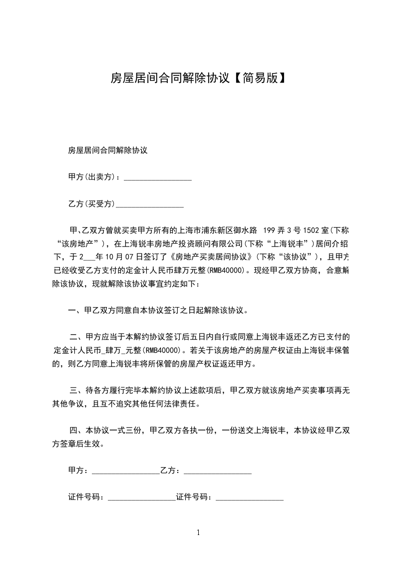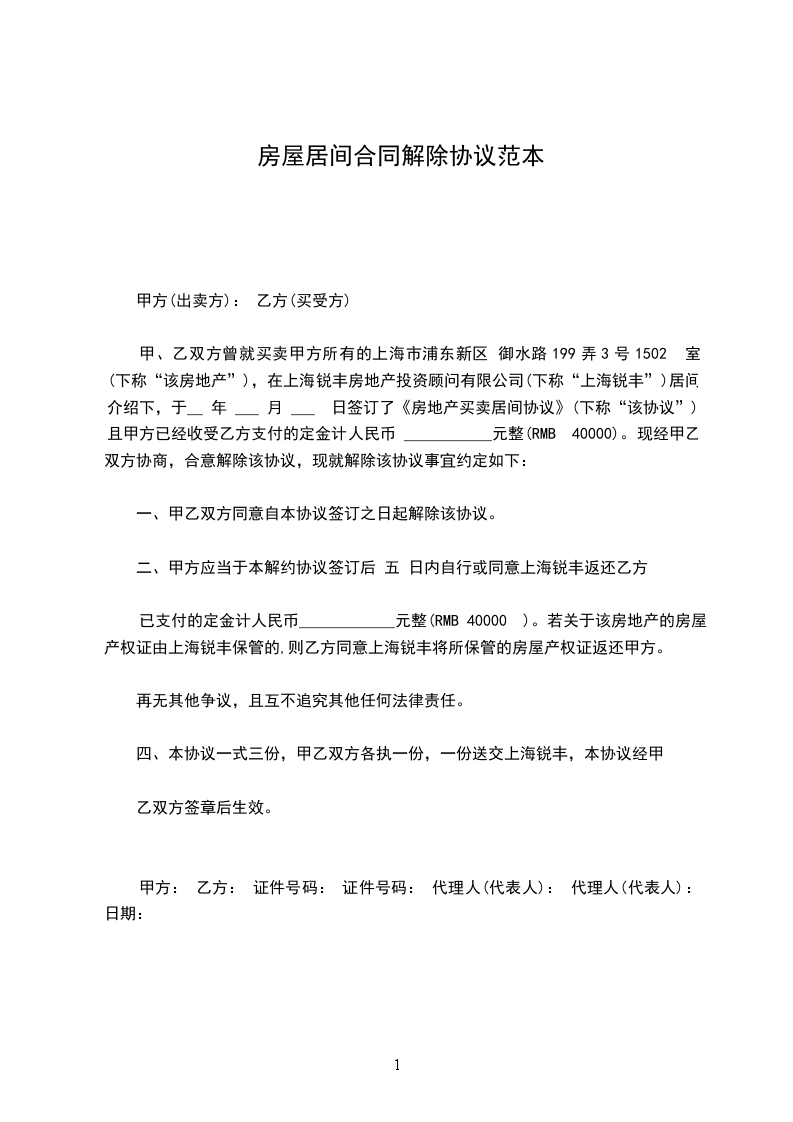 甲、乙双方曾就买卖甲方所有的上海市浦东新区 御水路199弄3号1502 室(下称“该房地产”),在上海锐丰房地产投资顾问有限公司(下称“上海锐丰”)居间介绍下,于__ 年 ___ 月 ___ 日签订了《房地产买卖居间协议》(下称“该协议”),且甲方已经收受乙方支付的定金计人民币 ___________元整(RMB 40000)。现经甲乙双方协商,合意解除该协议,现就解除该协议事宜约定如下: