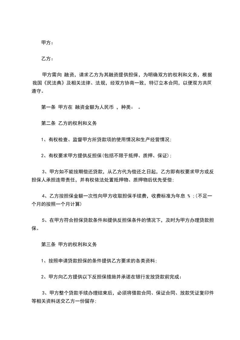 甲方需向 融资,请求乙方为其融资提供担保,为明确双方的权利和义务,根据我国《民法典》及相关法律、法规,经双方协商一致,特订立本合同,以便双方共同遵守。