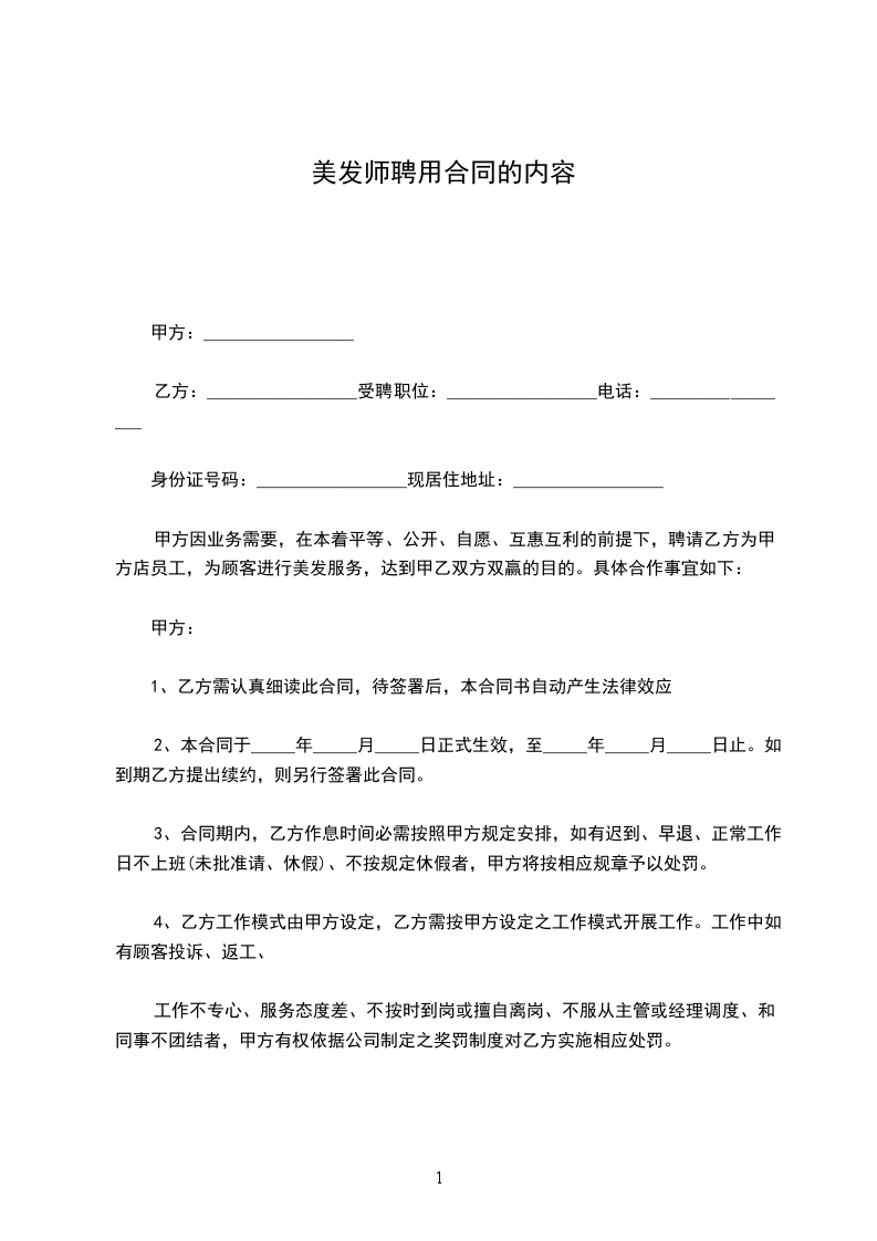 甲方因业务需要,在本着平等、公开、自愿、互惠互利的前提下,聘请乙方为甲方店员工,为顾客进行美发服务,达到甲乙双方双赢的目的。具体合作事宜如下: