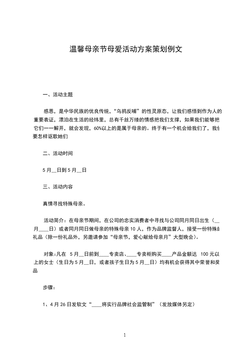 活动简介:在母亲节期间,在公司的忠实消费者中寻找与公司同月同日出生(__月____日)或者同月同日做母亲的特殊母亲10人,作为品牌监督人,接受一份特殊的礼品(除一份礼品外,另邀请参加“母亲节,爱心献给母亲月”大型晚会)。