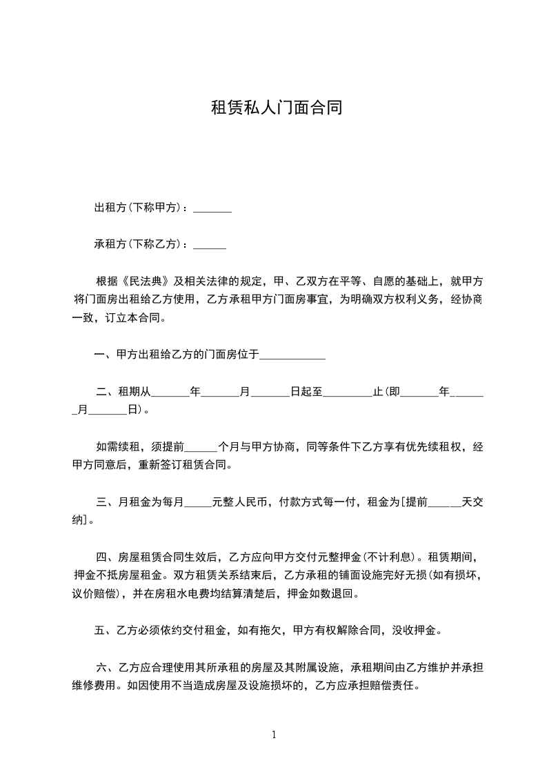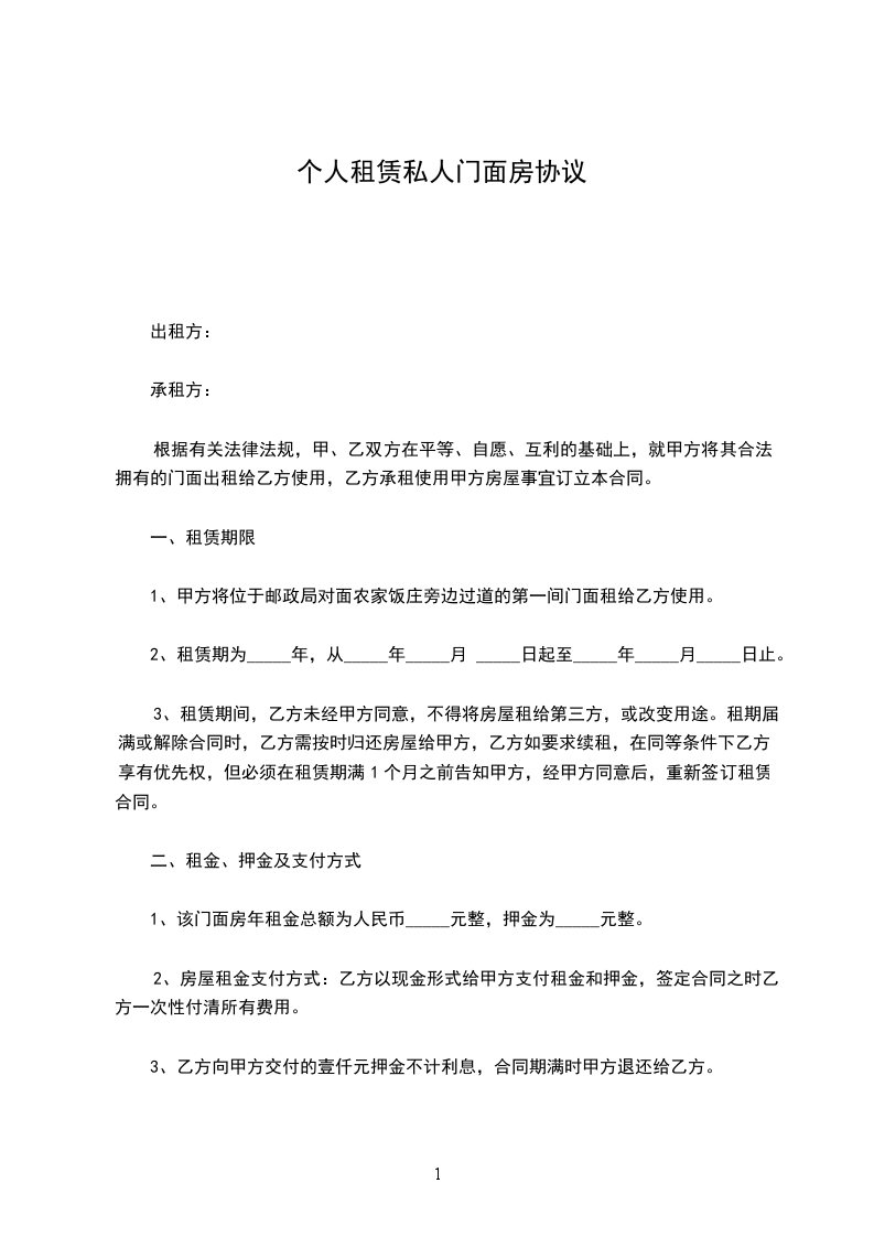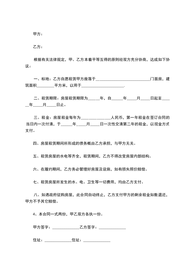一、甲方将座落于________________________一间面积为________________平方米的________门面租赁给乙方,作__________使用。
