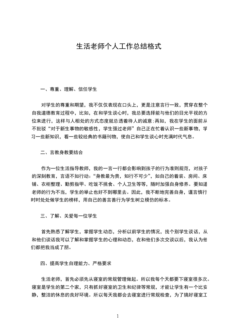 3、个人生活指导:包括帮助学生正确认识人生的意义和价值,培养积极向上的生活态度;尊重和体谅他人,能帮父母分忧,与父母同享快乐;懂得保护自己。在平时的工作中,我注重关心孩子们的健康成长,一有高度的责任心,二是勤快不怕脏,三是有一套科学有效的管理办法。学校规定的《生活教师职责》要求负责学生有生活时段的安全及卫生工作,在这方面我坚持早、中、晚清点人数,特别是晚上我要查几次,直到学生全部睡熟我才放心离开,夜里还要起来叫年龄小的孩子小便。