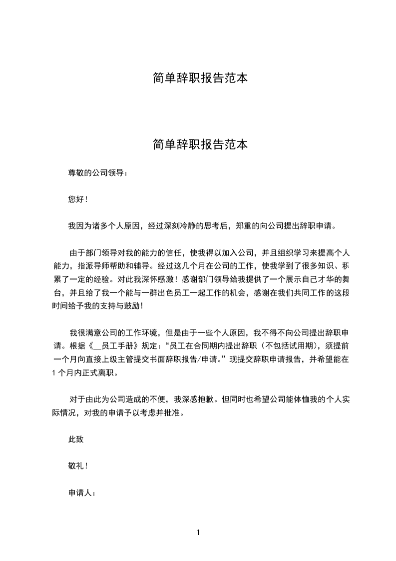 简单辞职报告范本