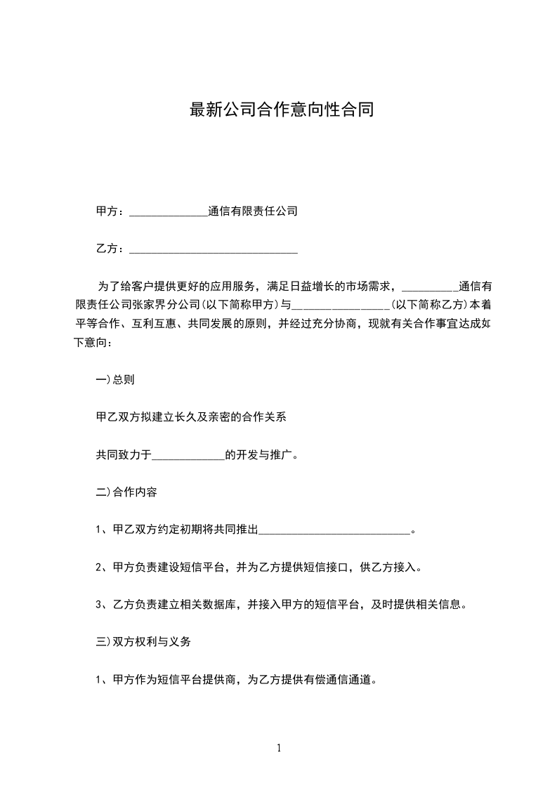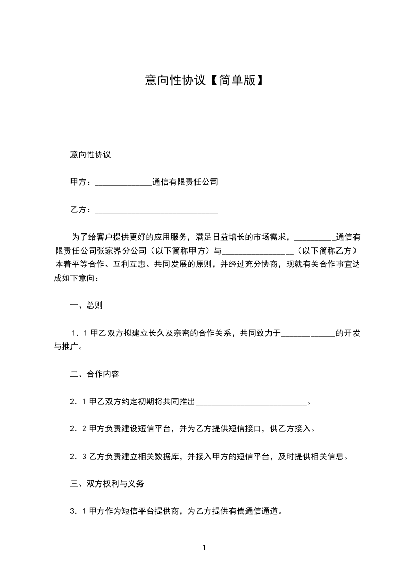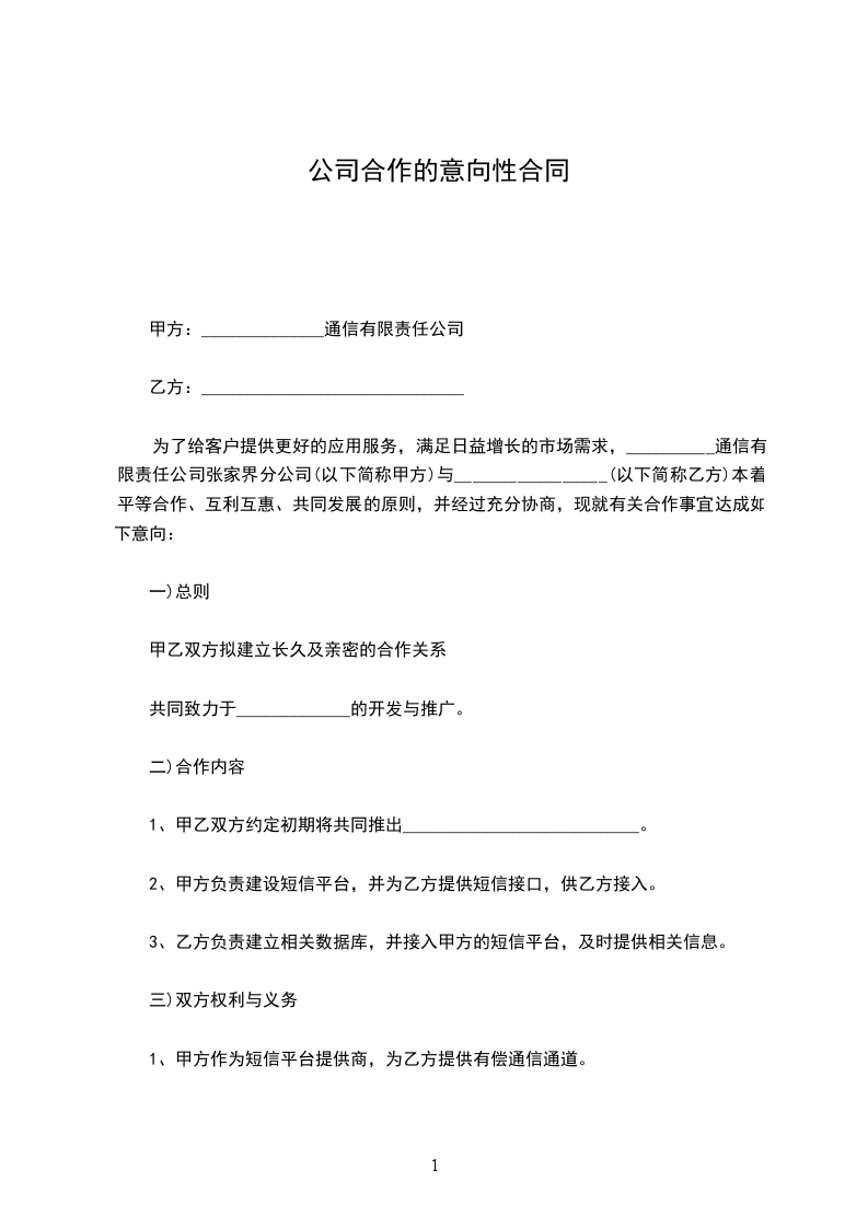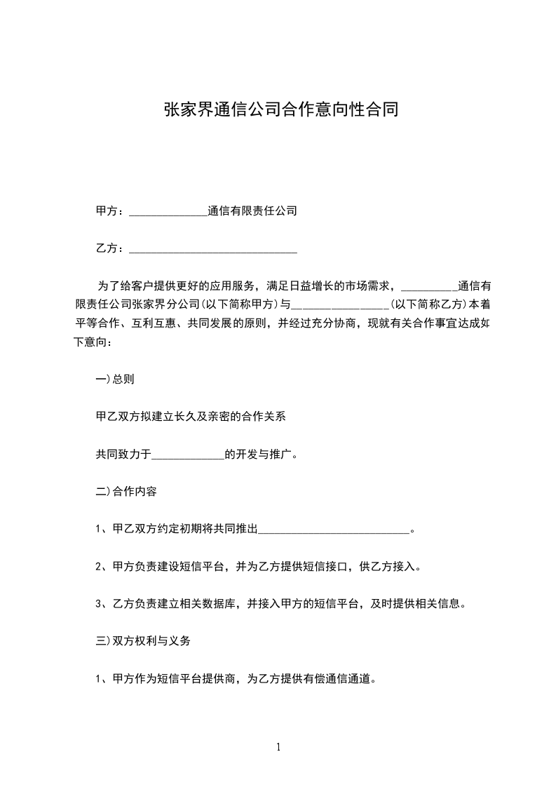 为了给客户提供更好的应用服务,满足日益增长的市场需求,__________通信有限责任公司张家界分公司(以下简称甲方)与_________________(以下简称乙方)本着平等合作、互利互惠、共同发展的原则,并经过充分协商,现就有关合作事宜达成如下意向: